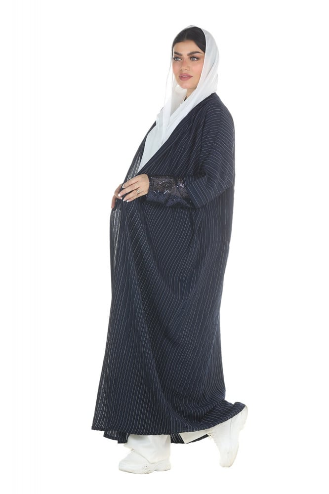 - تتميز العباية الكحلي بتصميمها العصري والأنيق وخاصةً بتدخيله الترتر الكحلي في الكم التي تعطيها مظهرًا مميزًا.