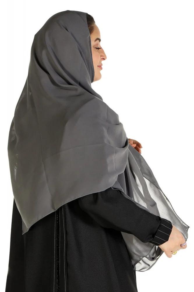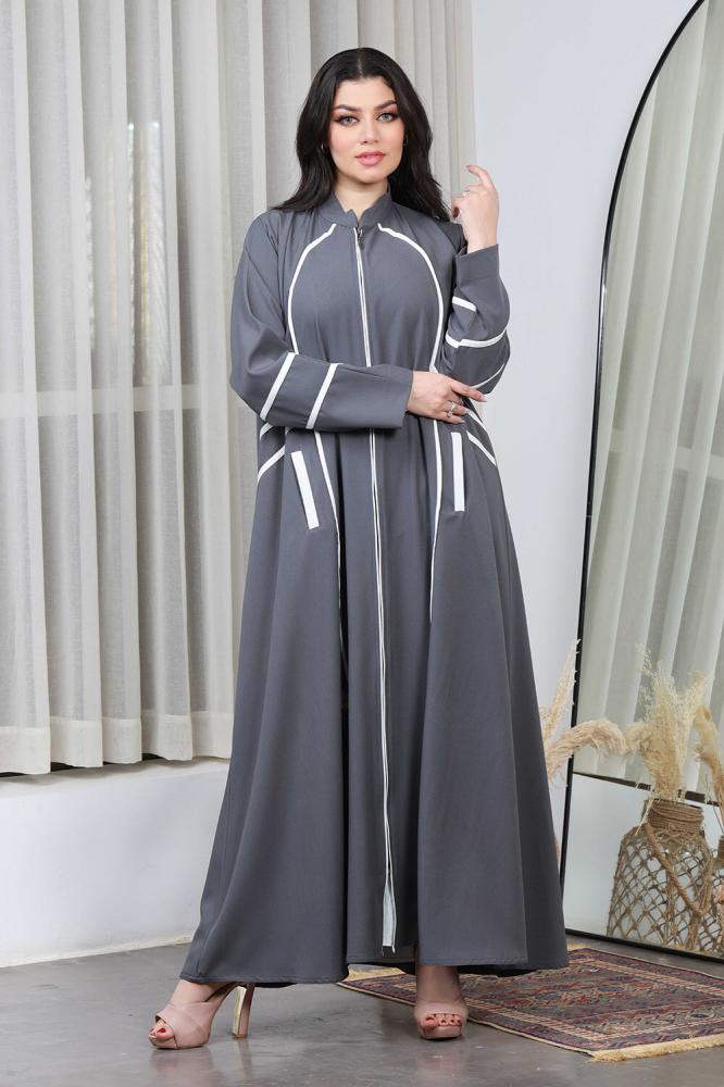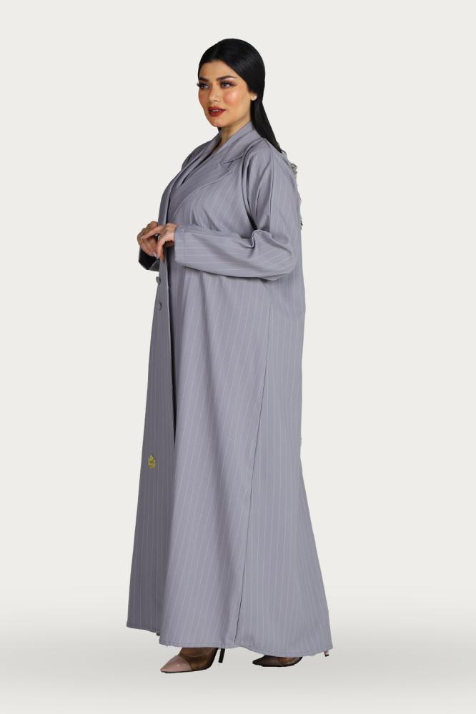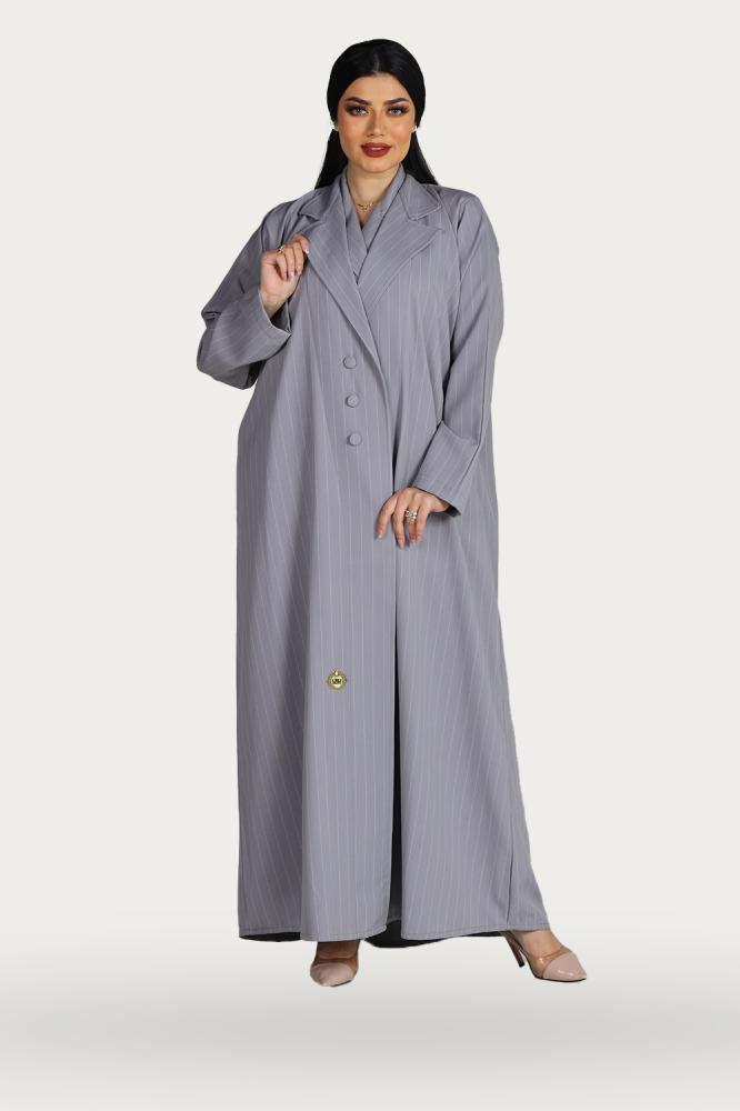 هذه العباية تتميز بلون رصاصي مقلم يضفي على مظهرك لمسة من الفخامة والجاذبية. صُنعت من قماش الكريب الفاخر الذي يمنحك شعورًا بالنعومة والراحة طوال اليوم.