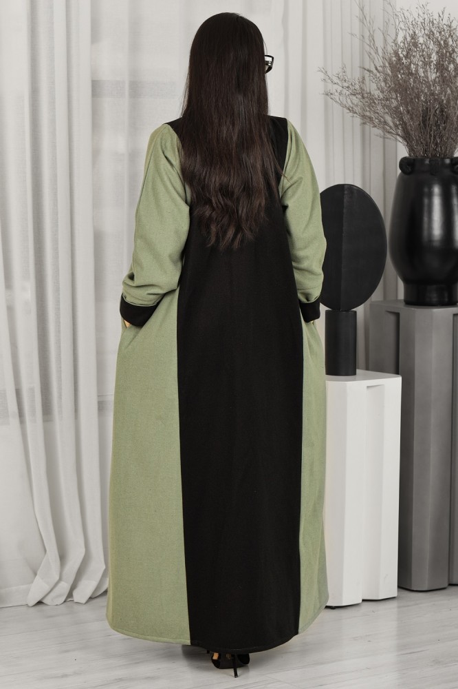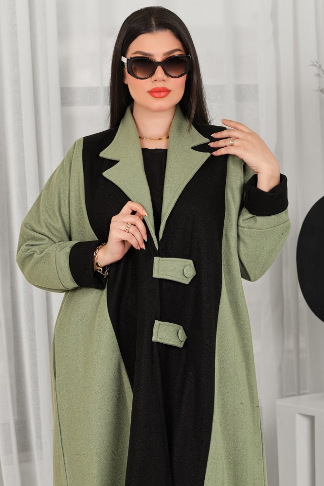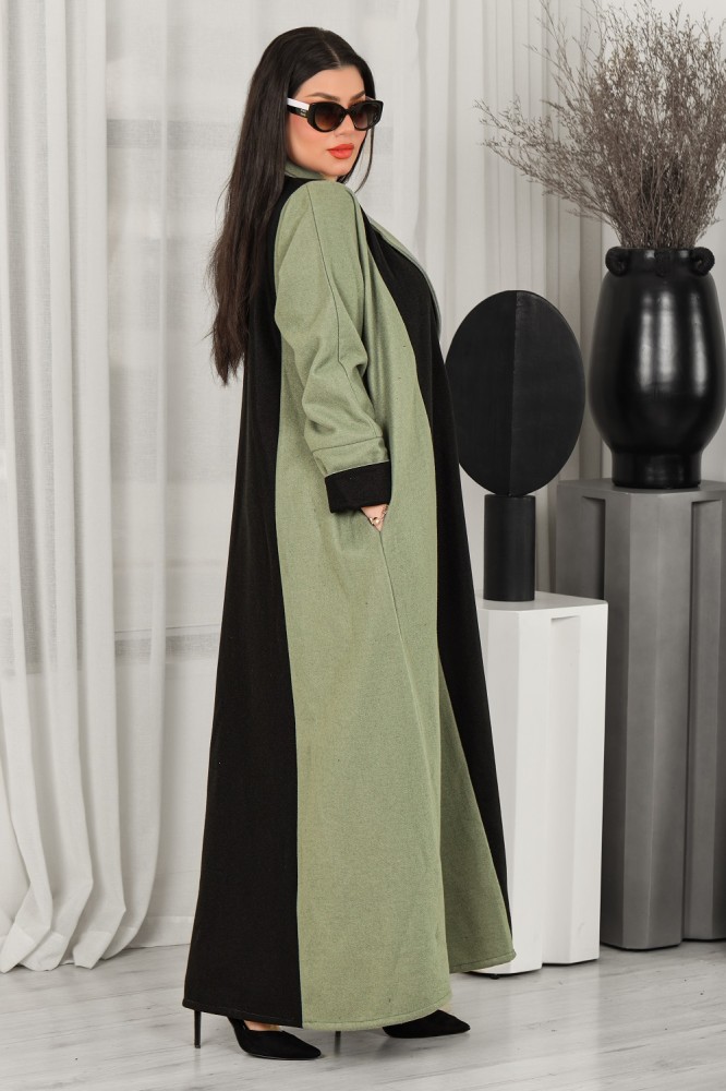 - تتميز العباية بلونين متداخلين بشكل جميل، الأسود والأخضر، مما يخلق تناغمًا مثاليًا بين اللونين. الزران كبس المخفيان يُضفيان لمسة نهائية أنيقة على التصميم، ويسهمان في إضفاء طابع جمالي فريد على العباية.