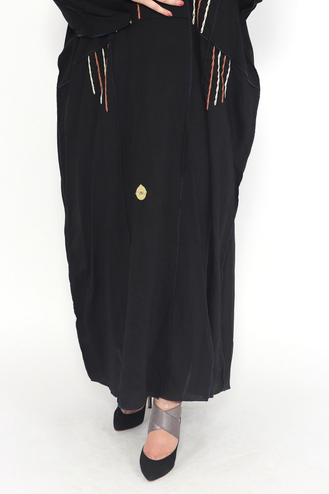 - تم تزويد العباية بقصة واسعة مزينة بشغل يد بألوان هادية وأنيقة، وهو ما زاد من اللمسة الساحرة والفريدة من نوعها للعباية.