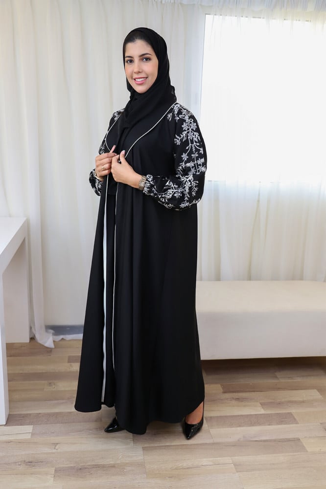 مواصفات عباية نص كلوش اسود قلاب بتطريز ابيض في الكم