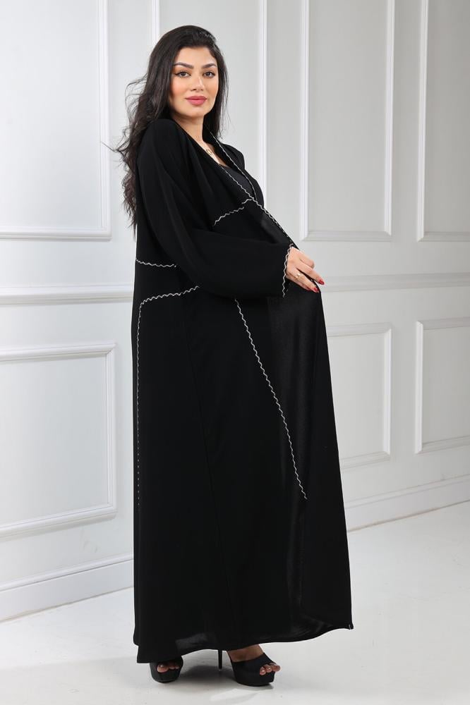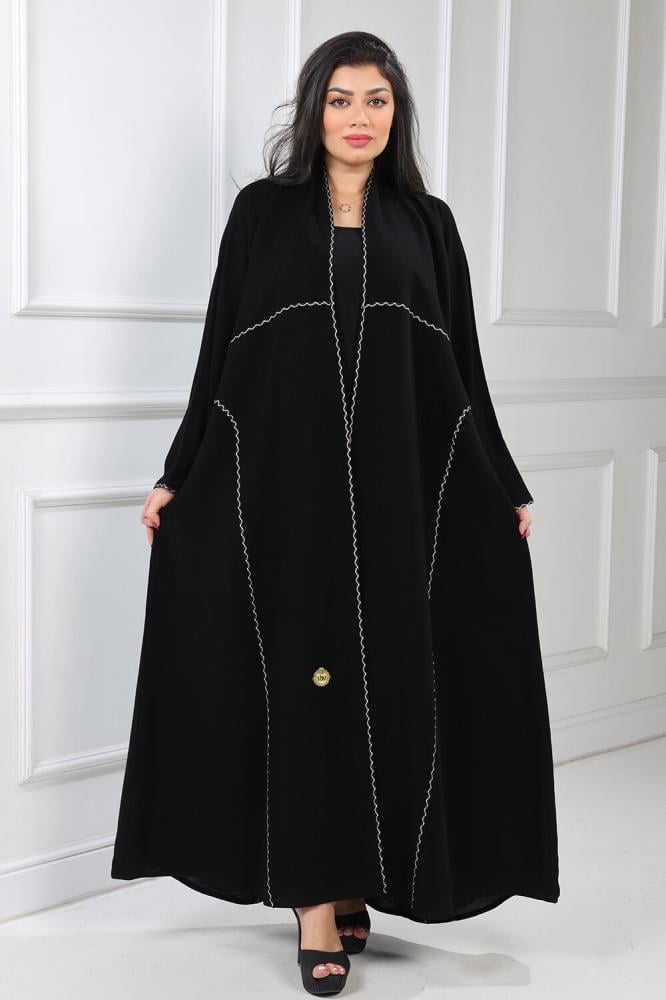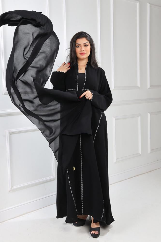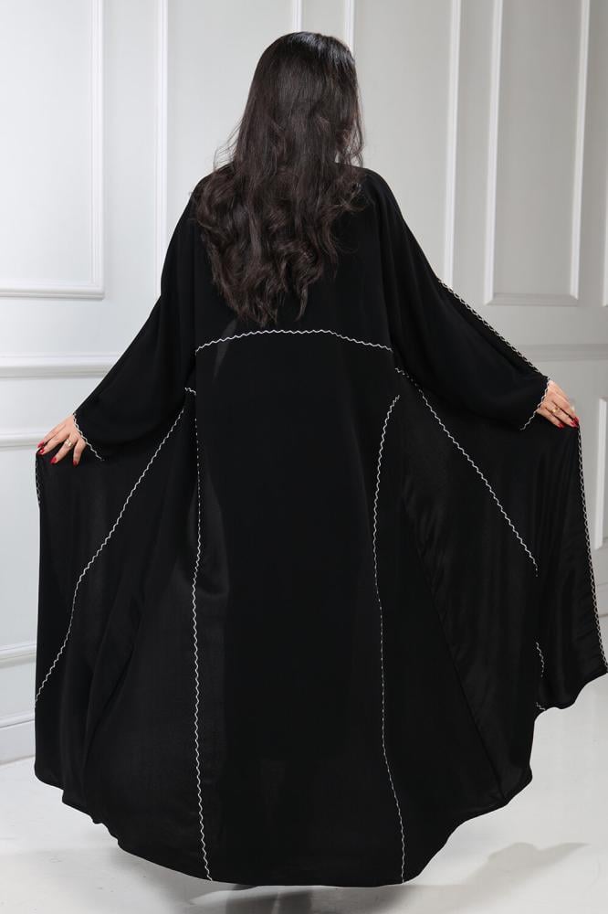 عباية نصف كلوش منسوجة من قماش الكريب الأسود مع طرحتها.