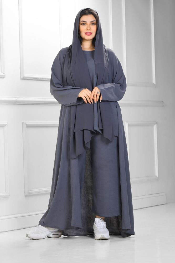 عباية "همسة" (Hamsa) الرصاصية (3 قطع): أناقة اللون المحايد ورفاهية الكريب