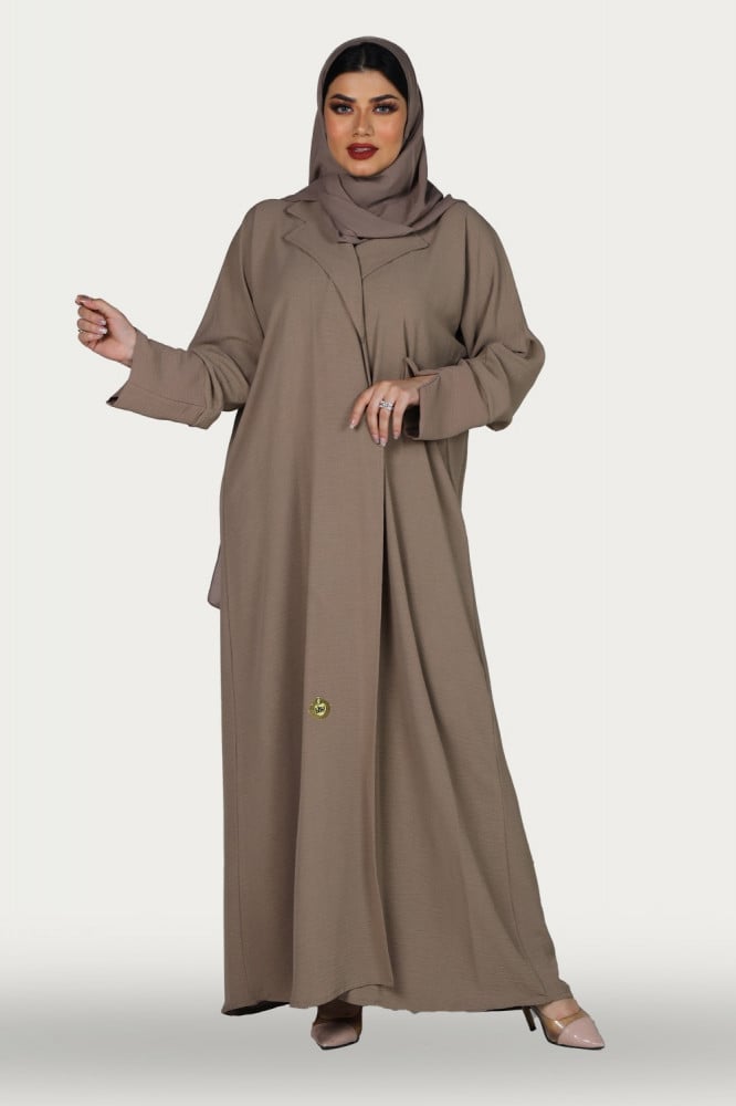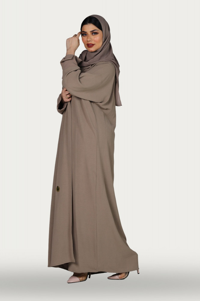 - العباية ذات لون بني فاتح محايد وسهل التنسيق مع ملابس مختلفة، مما يجعل العباية مناسبة لمختلف المناسبات والإطلالات.
