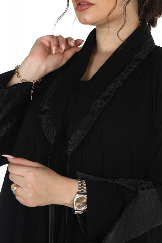 - تتميز بوجود قماش مشجر اسود في الجوانب والكم، مما يضيف لها لمسة أنثوية وجمالية.