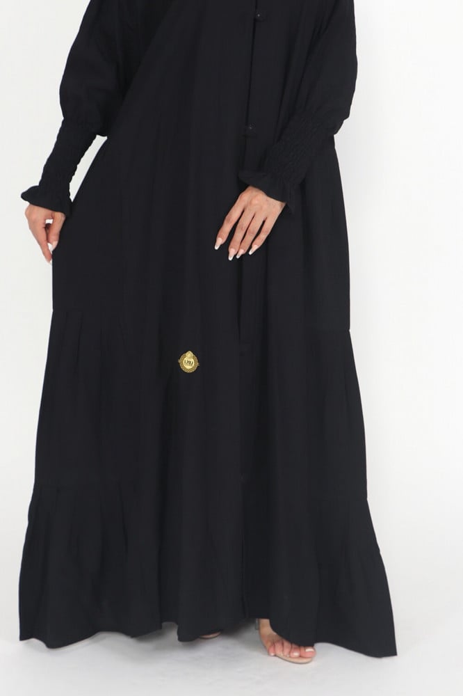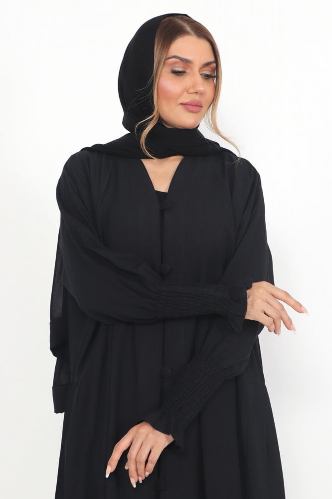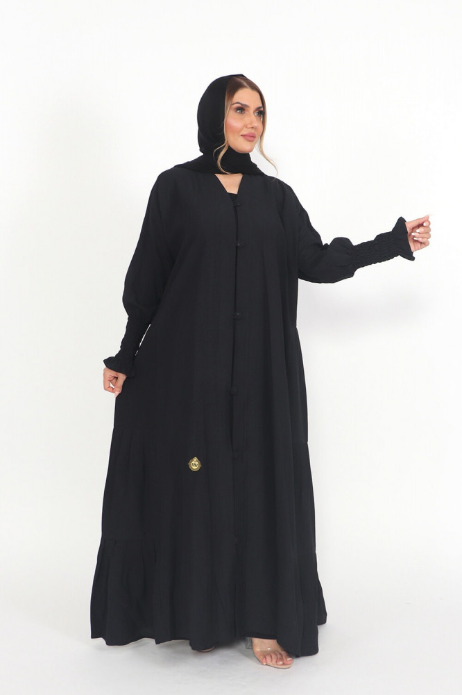 - تتميز العباية بقفلة زرارات عصرية تضفي لمسة عصرية على التصميم وتحافظ في الوقت نفسه على سهولة ارتداء العباية.