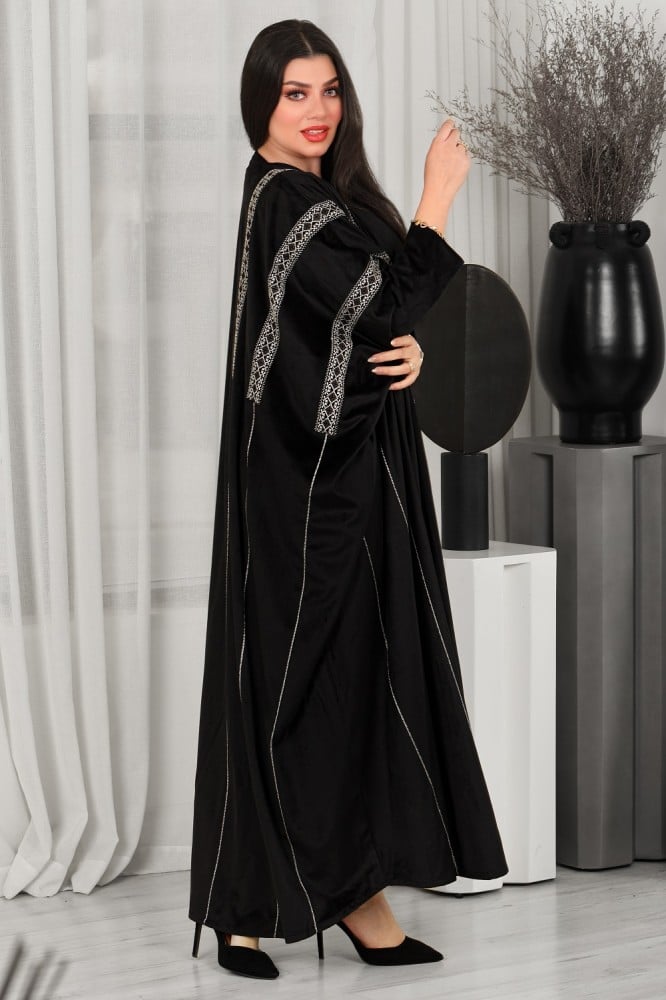 - تمتاز هذه العباية بنوعية القماش المخمل الناعم، الذي يضمن الراحة والإحساس بالانسجام والراحة خلال ارتدائها.