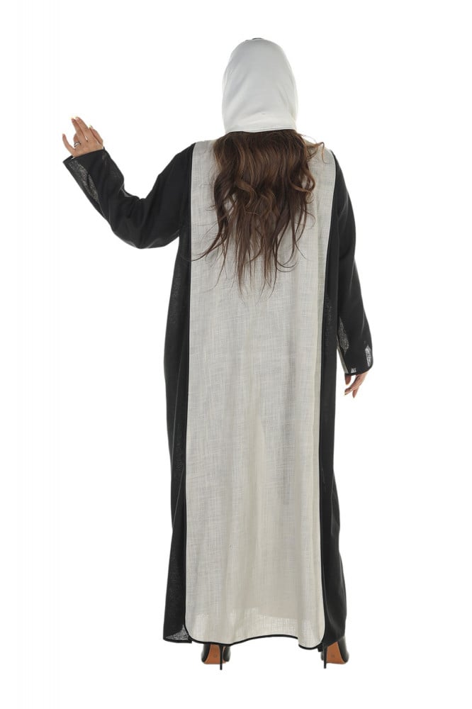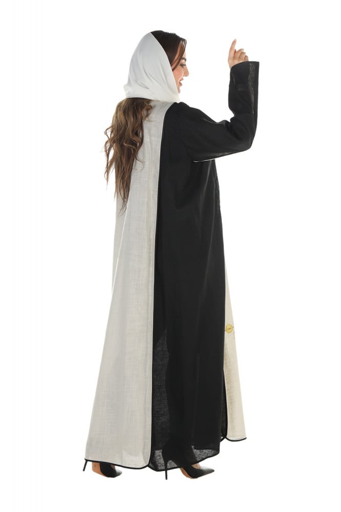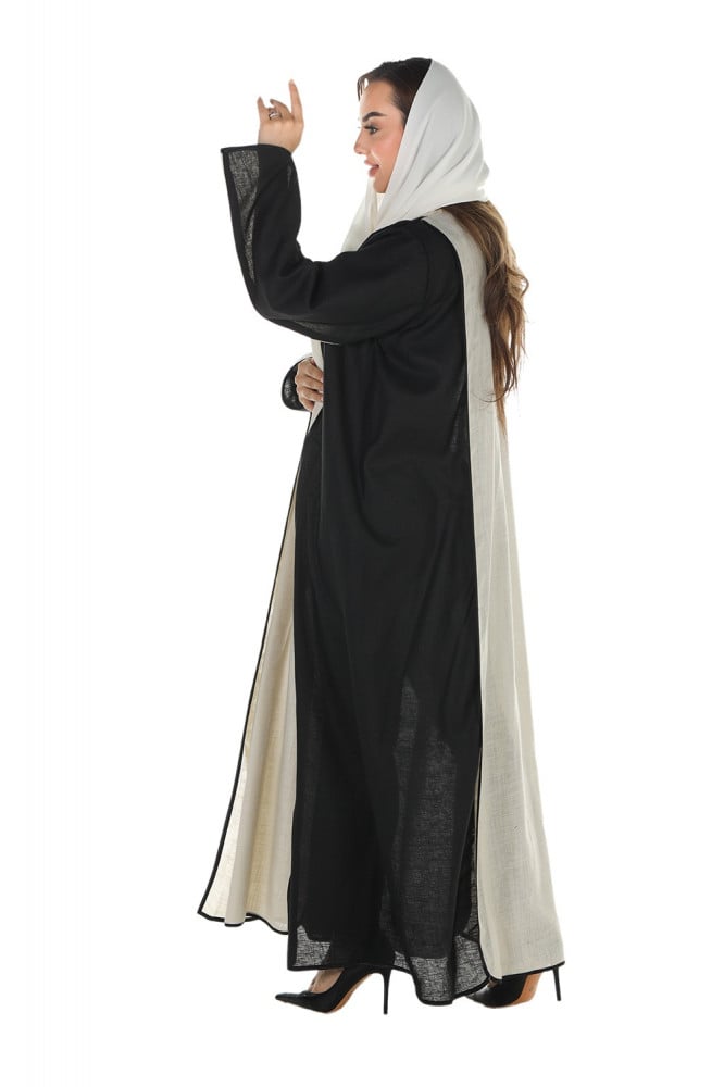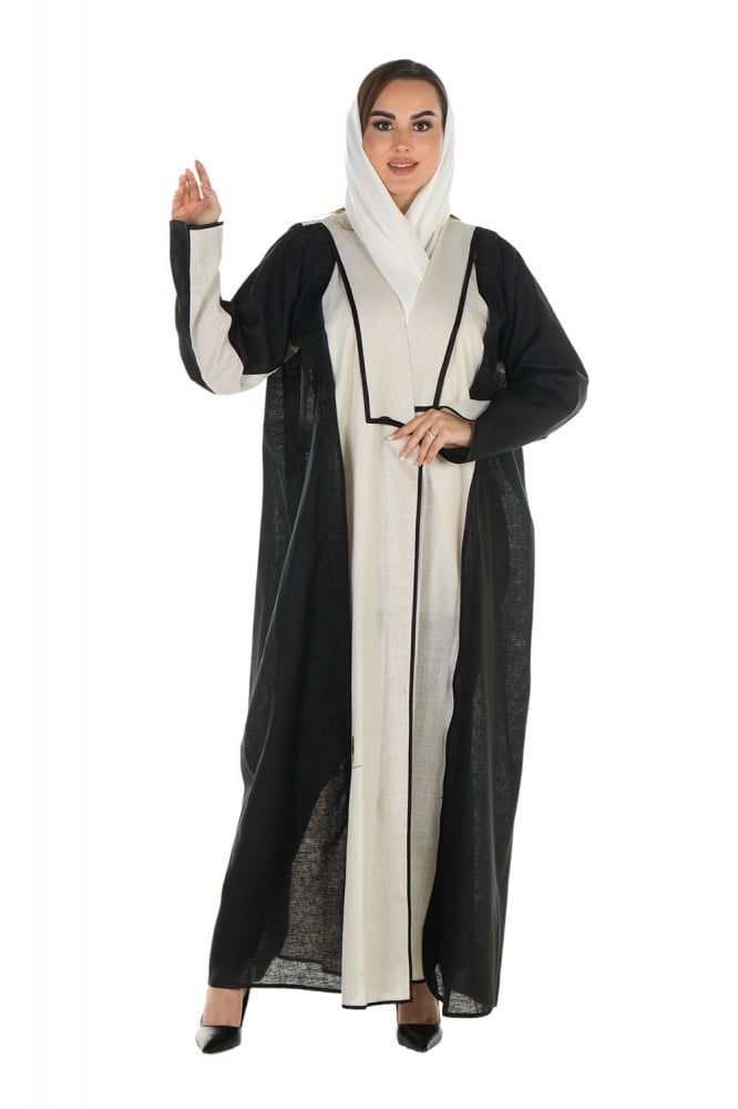 - العباية السوداء في بيج بقماش اللينين محددة بستان أسود تتميز بتصميمها المميز والجذاب.