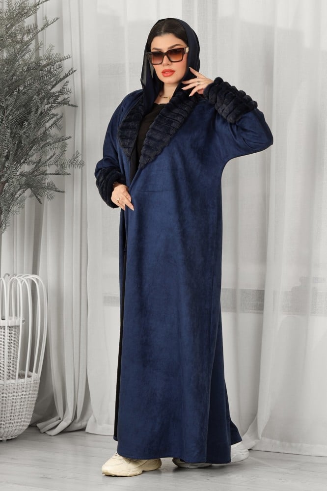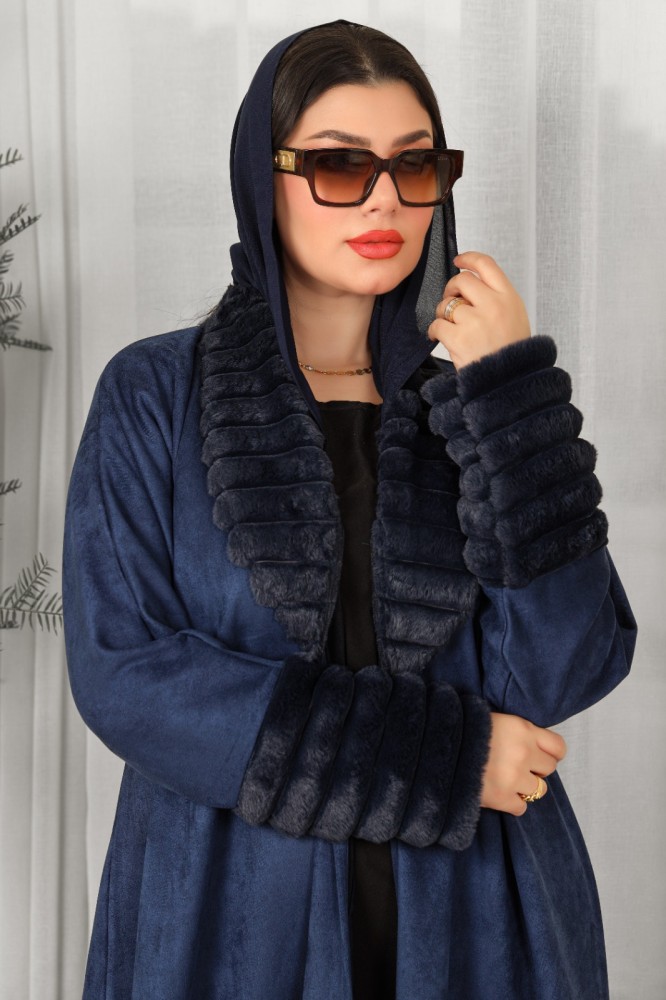 - تُصنع هذه العباية من قماش الشامواه الناعم، وتتميز بتفاصيل فاخرة من فرو كحلي في القلاب والكم. يُضفي هذا الفرو لمسة من الفخامة والراحة على البشرة، مما يجعلها مثالية للاستمتاع بالدفء في الأيام الباردة.