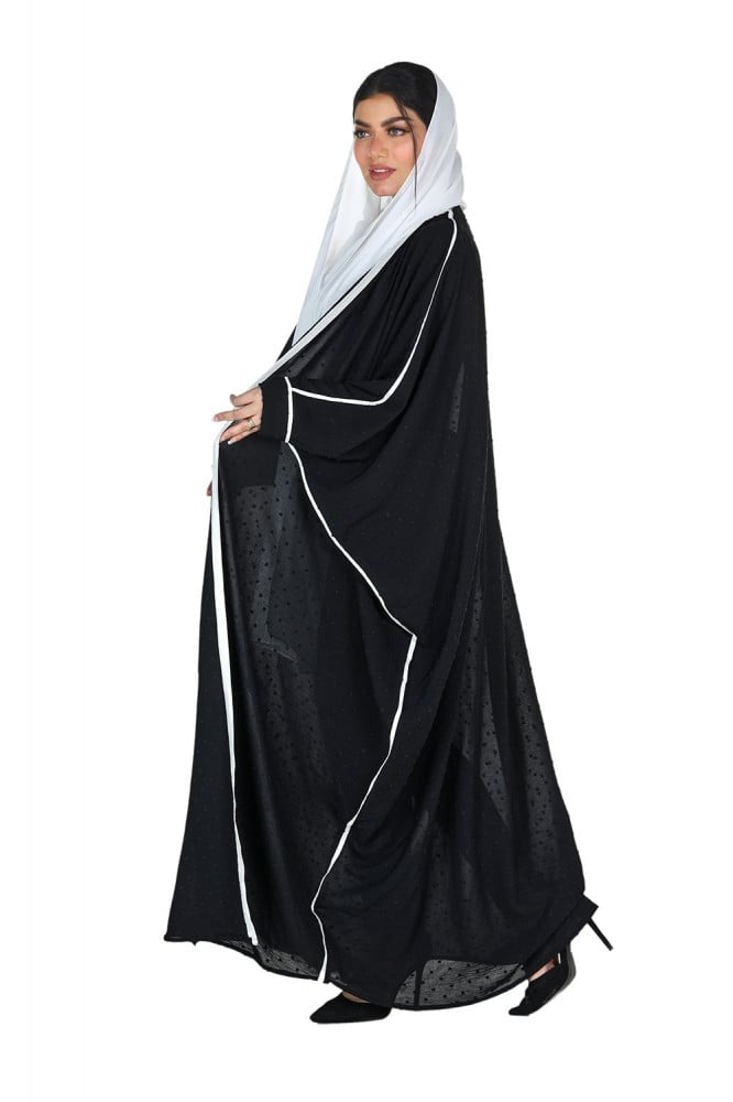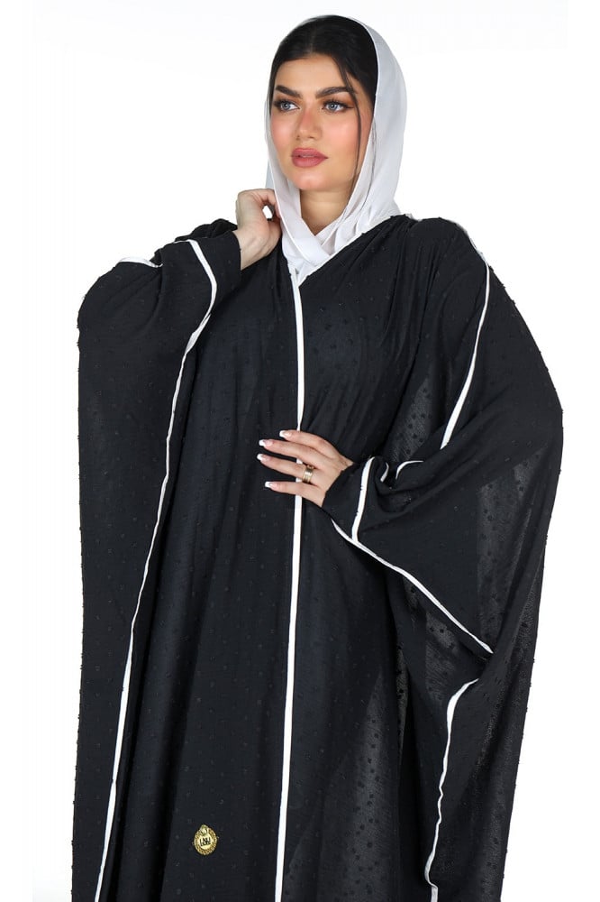 - تم تزويد العباية بتدخيله تحديد بقماش سكري في الأمام والجوانب والكم، والذي أضاف اللمسة الساحرة والفريدة من نوعها للعباية.