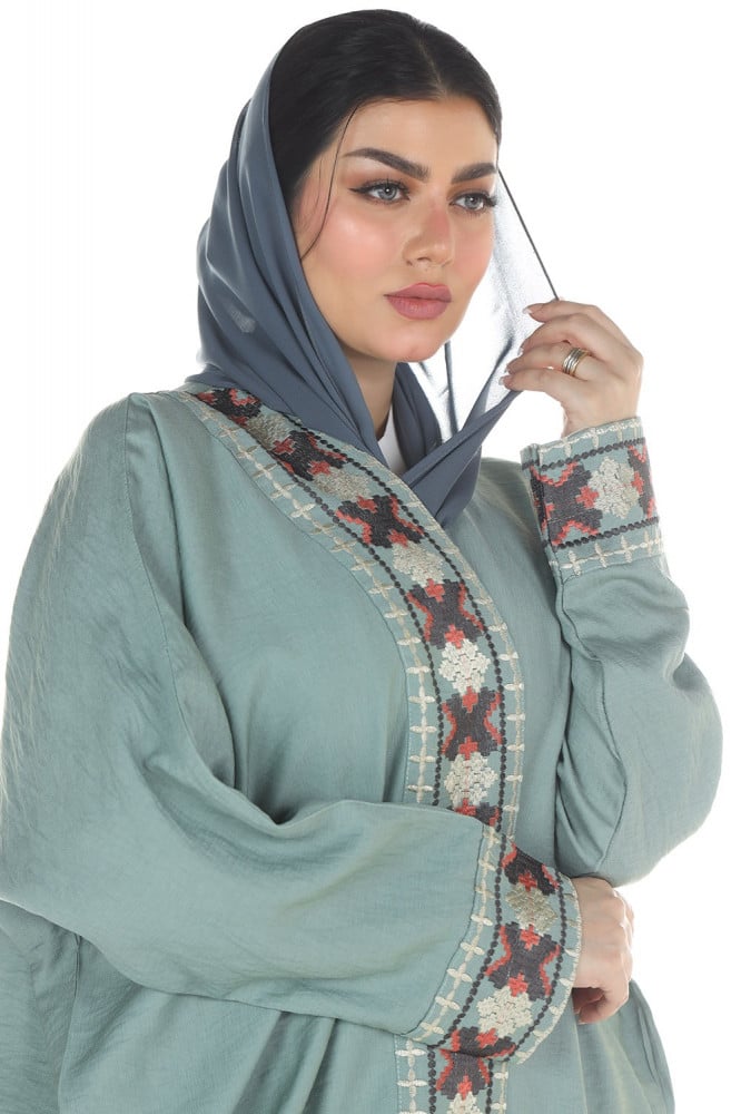 - عباية أنيقة ومميزة تأتي بلون تيفاني مميز وتصميم عصري وأنيق وخاصةً الكلفة التطريز التي توجد في يمين العباية وفي الكم والتي تعطيها مظهرًا مميزًا.