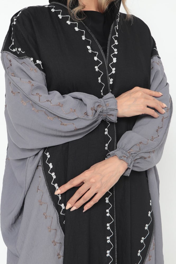 عباية لف سوداء واسعة مع تطريز في الكم والأمام