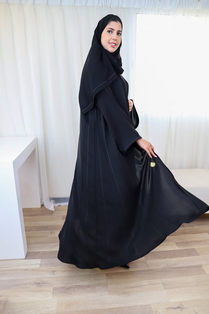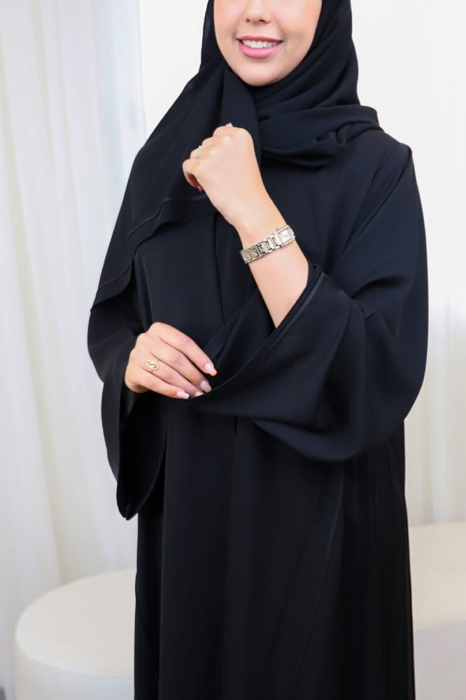 - تتميز العباية بقيطان في الكم والجوانب على شكل خطوط يضفي لمسة من الجمال والأناقة الكلاسيكية، مما يجعلها قطعة فريدة ومميزة في خزانة ملابسك.