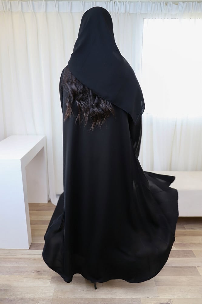 مواصفات عباية نص كلوش سوداء لمسة حرير بقيطان في الكم والجوانب