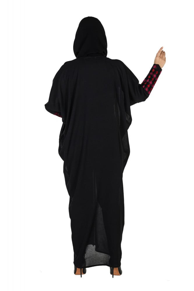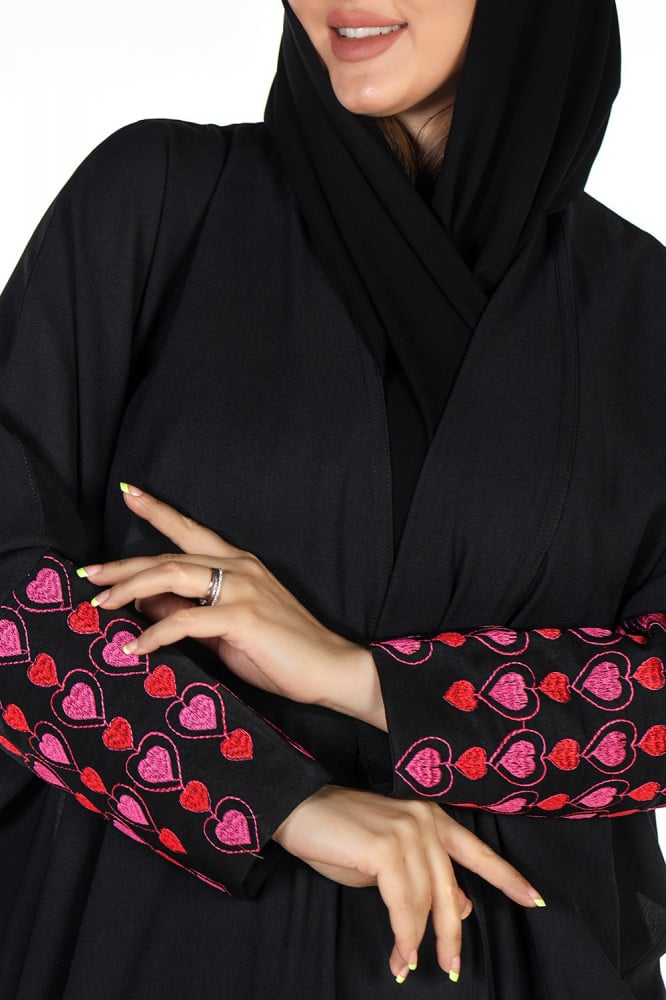 - تم تزويد العباية بالتطريز المميز على شكل قلوب فوشي وأحمر، والذي أضاف اللمسة المميزة والفريدة من نوعها للعباية.