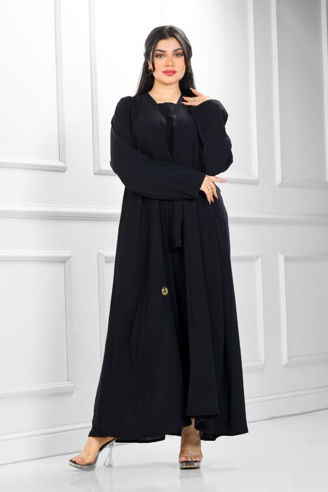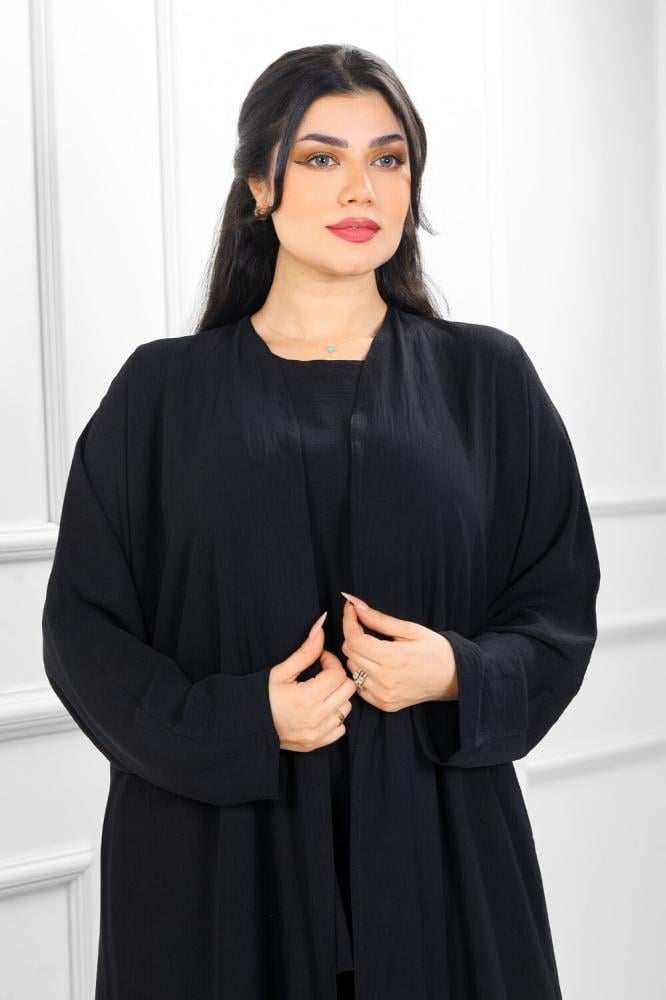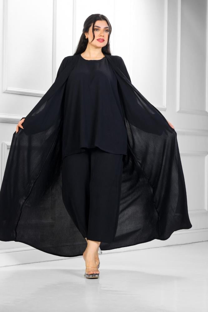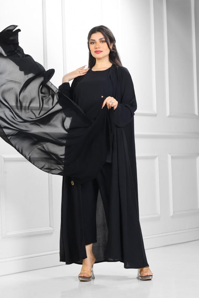 مواصفات طقم "العباية الملكية" السوداء القفلة: لف. اللون: أسود داكن (Jet Black). نوع الكم: عادي. القماش: كريب ناعم منسدل وبارد. أخـــرى: الطقم يشمل طرحة مجانية، مع تصميم سديري وبنطلون متطابقين، جميعها من ذات خامة الكريب الفاخر.