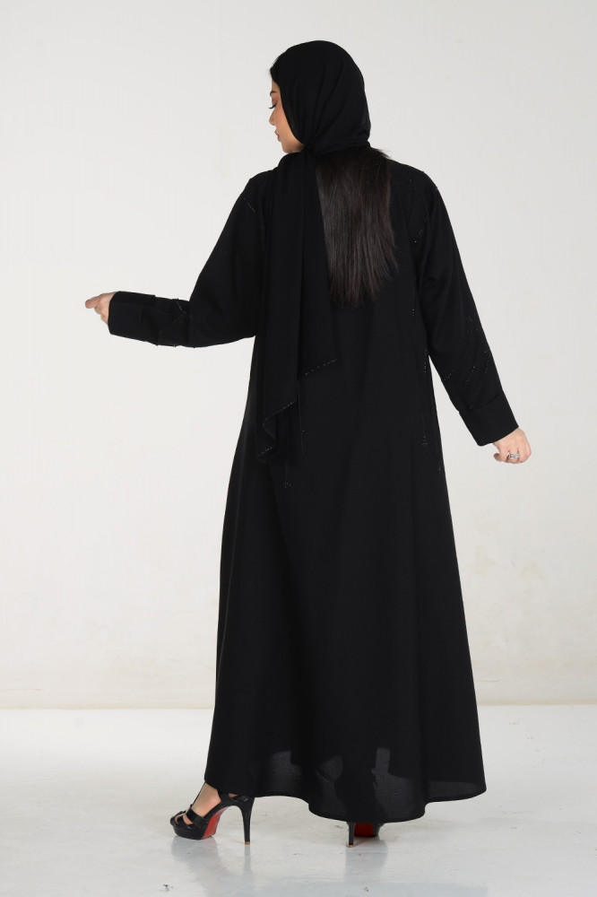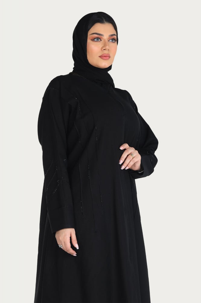 مميزات عباية قماش كريب سوداء نصف كلوش مخيوط بكريستال اسود
