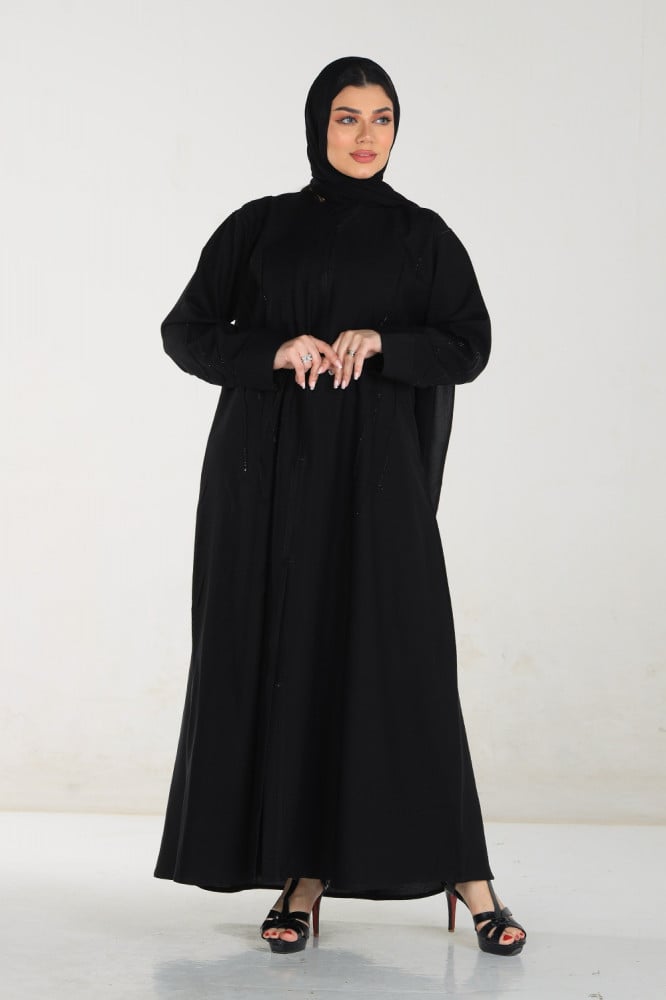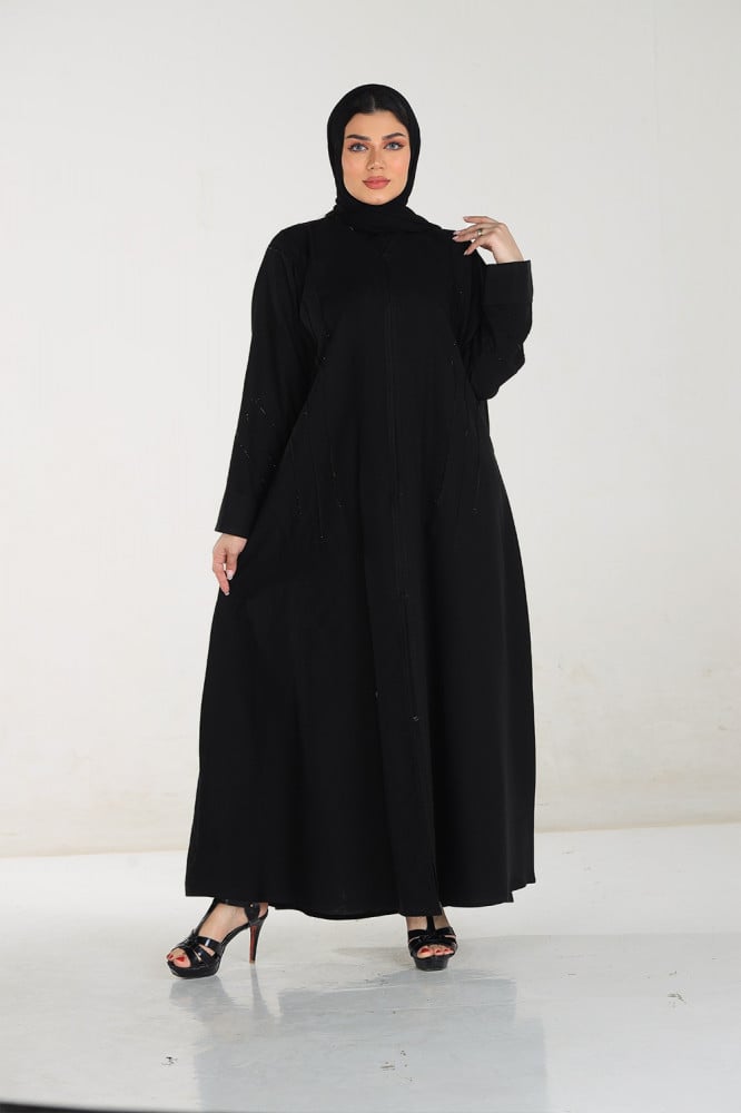 مواصفات عباية نصف كلوش سوداء من قماش الكريب الفاخر بزرارات سوداء