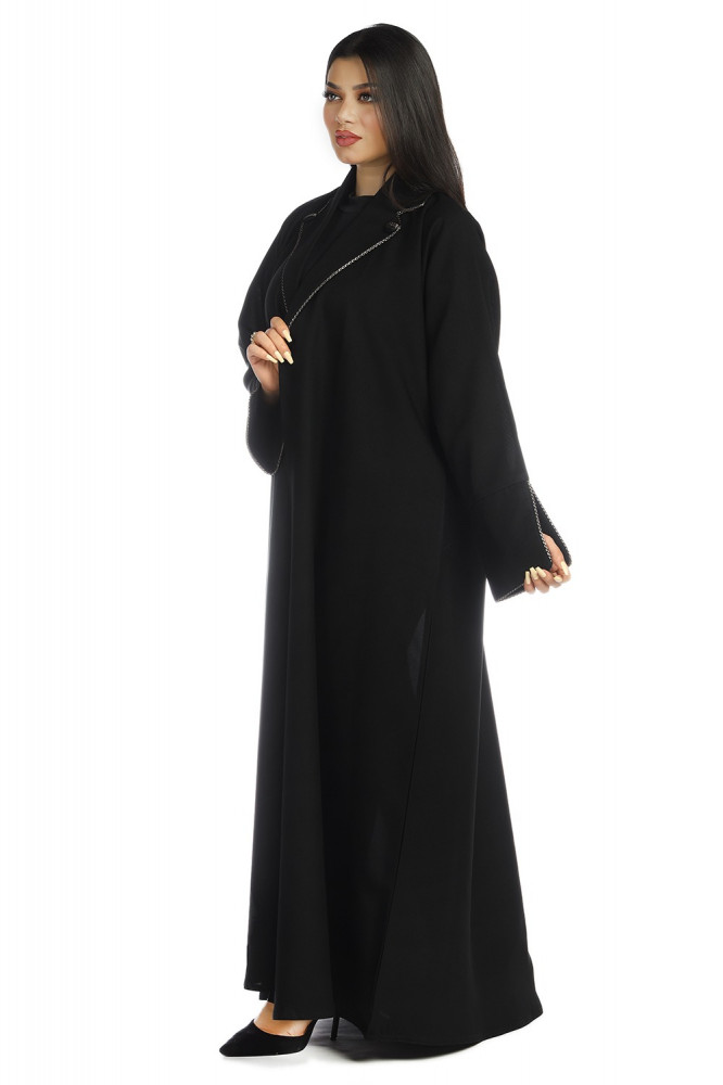 هذه العباية الفاخرة تأتي بتصميم قلاب سوداء مطرزة بأسلوب مميز وجذاب، تم صنعها بأستخدام قماش الكريب الفاخر ما يجعلها خفيفة الوزن وسهلة الحركة، كما أنها تأتي بقفلة لف لسهولة الارتداء.