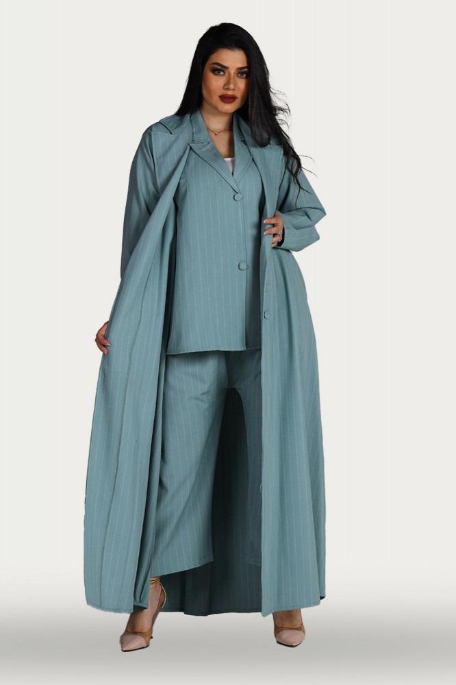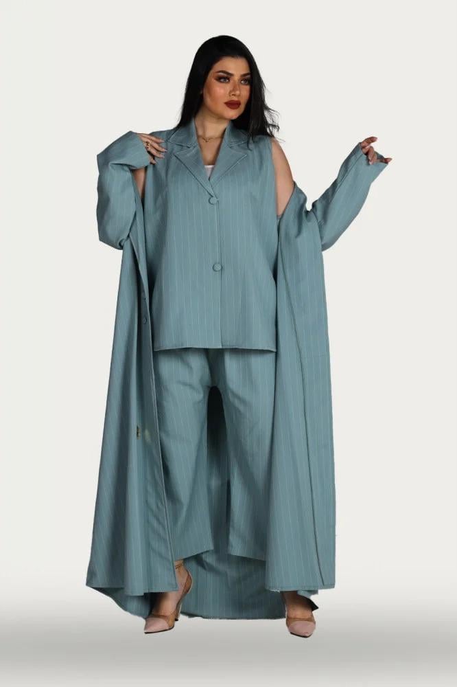 1. عباية لون تيفاني مقلم منسوجة من قماش الكريب الفاخر مع طرحة مجانية