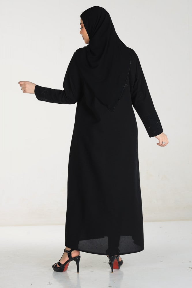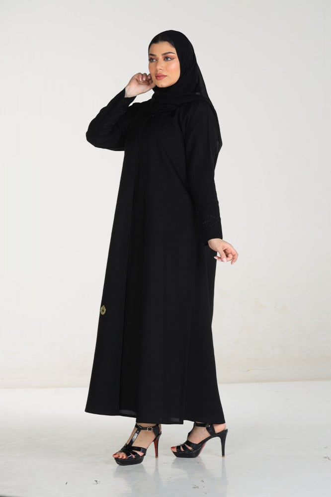 - تأتي العباية بتصميم مستوحى من أحدث صيحات الموضة، مع تطريز أسود على الكم يضيف لمسة راقية للإطلالتك.