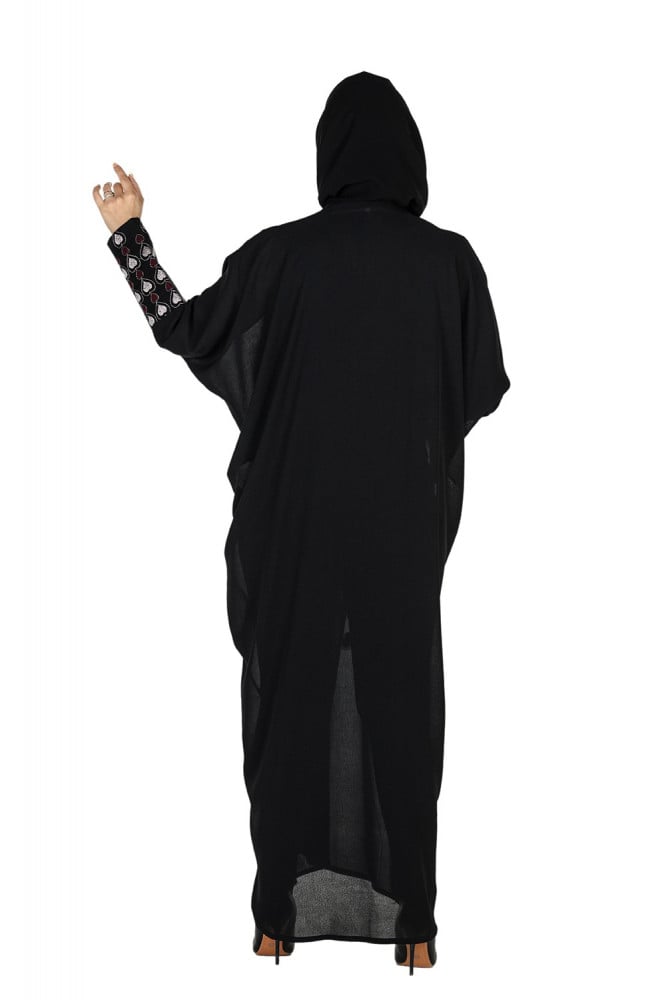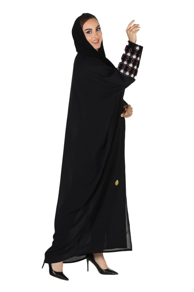 - تم تزويد العباية بالتطريز المميز على شكل قلوب بلون عنابي وزهري، والذي أضاف اللمسة المميزة والفريدة من نوعها للعباية.