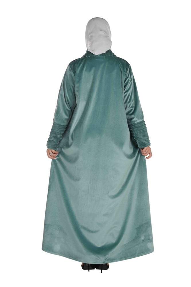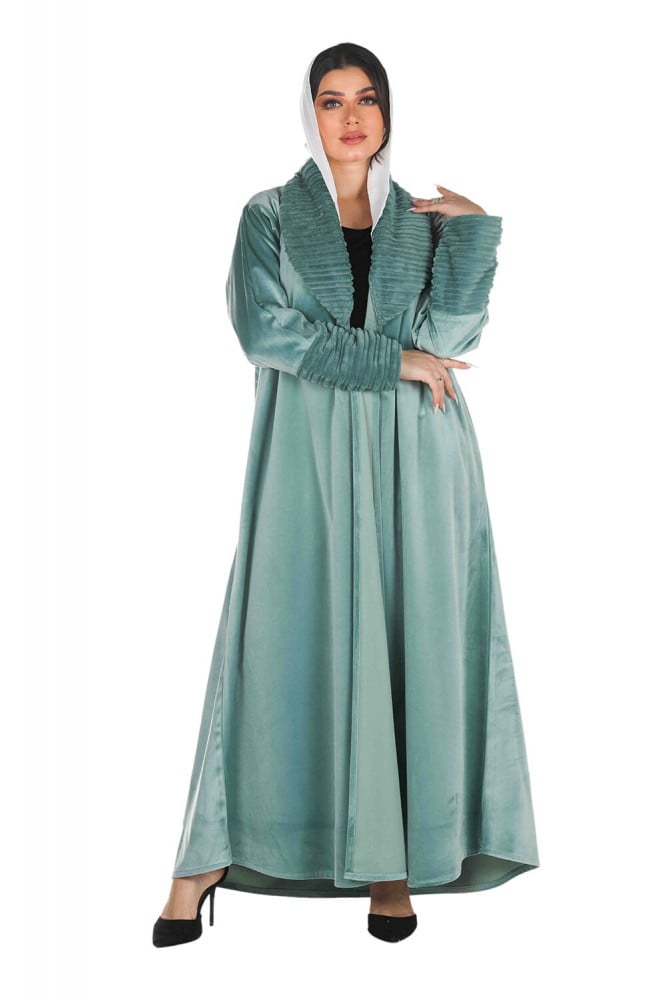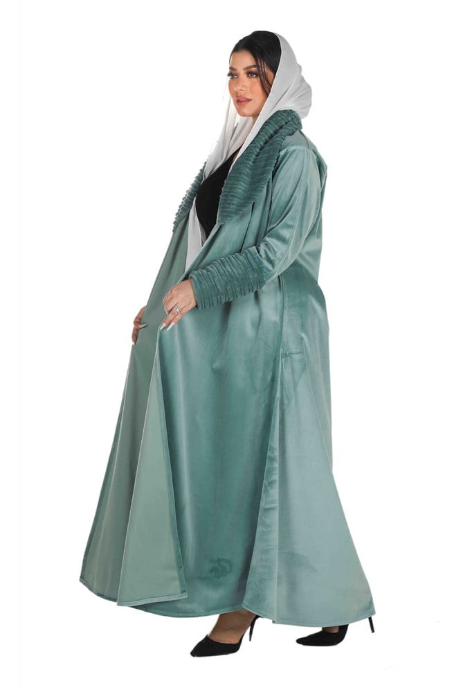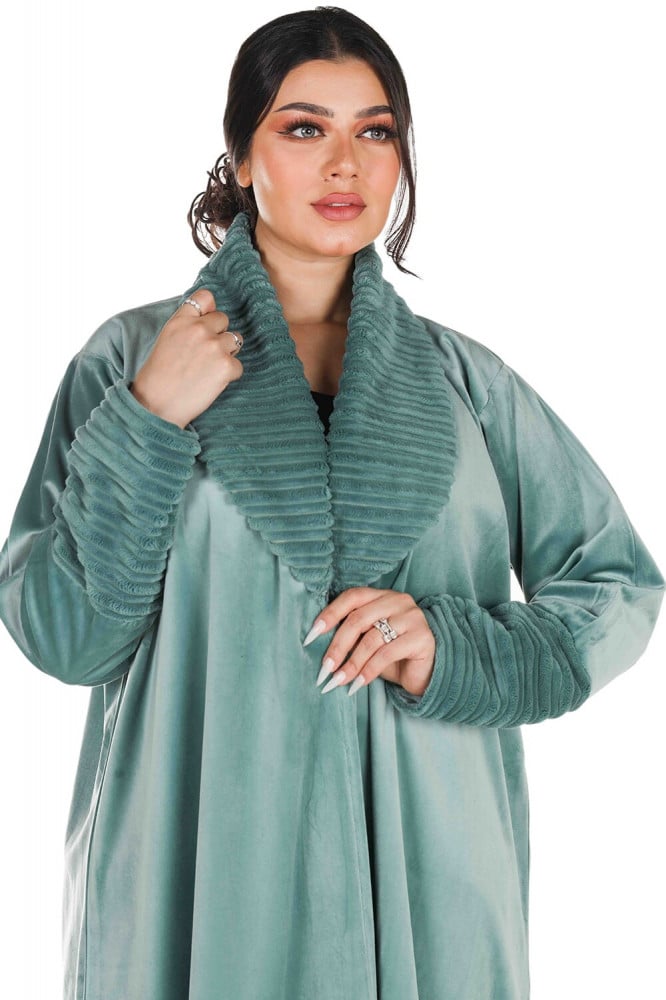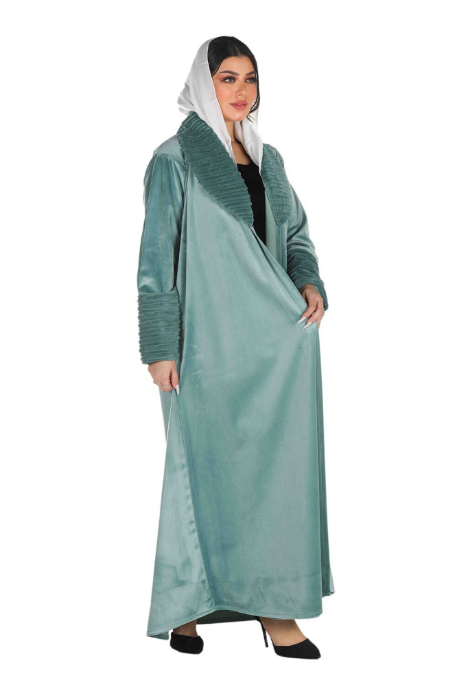 مواصفات عباية شتوية لف تركوازي من قماش مخمل تدخيله فرو في الكم