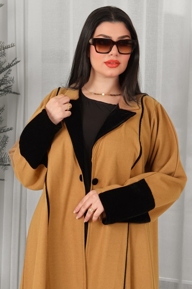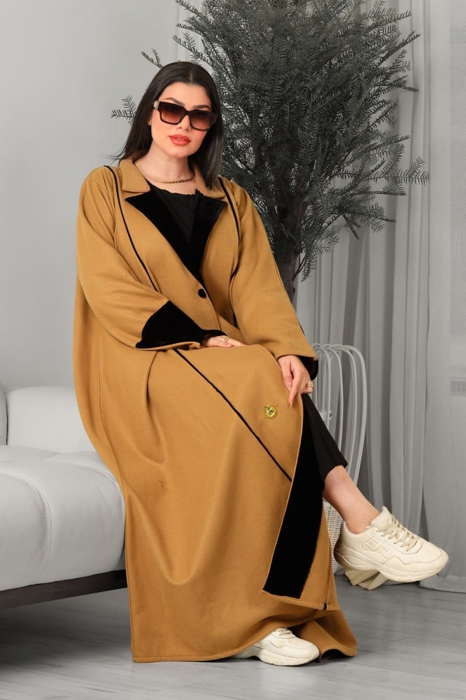 - يتميز تصميم العباءة بتدخيل مخمل أسود في القلاب والأكمام، مما يعزز من جاذبيتها ويُضفي لمسة من الفخامة والأناقة.