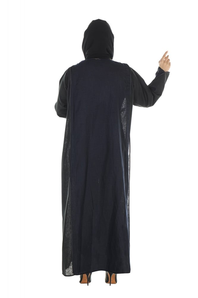 - تدخيلات رائعة: تدخيلة من قماش اللينين الكحلي المحدد بستن أسود تضيف لمسة فاخرة وأنيقة إلى العباية، مما يجعلها قطعة فريدة تتألقين بها في أي مناسبة.