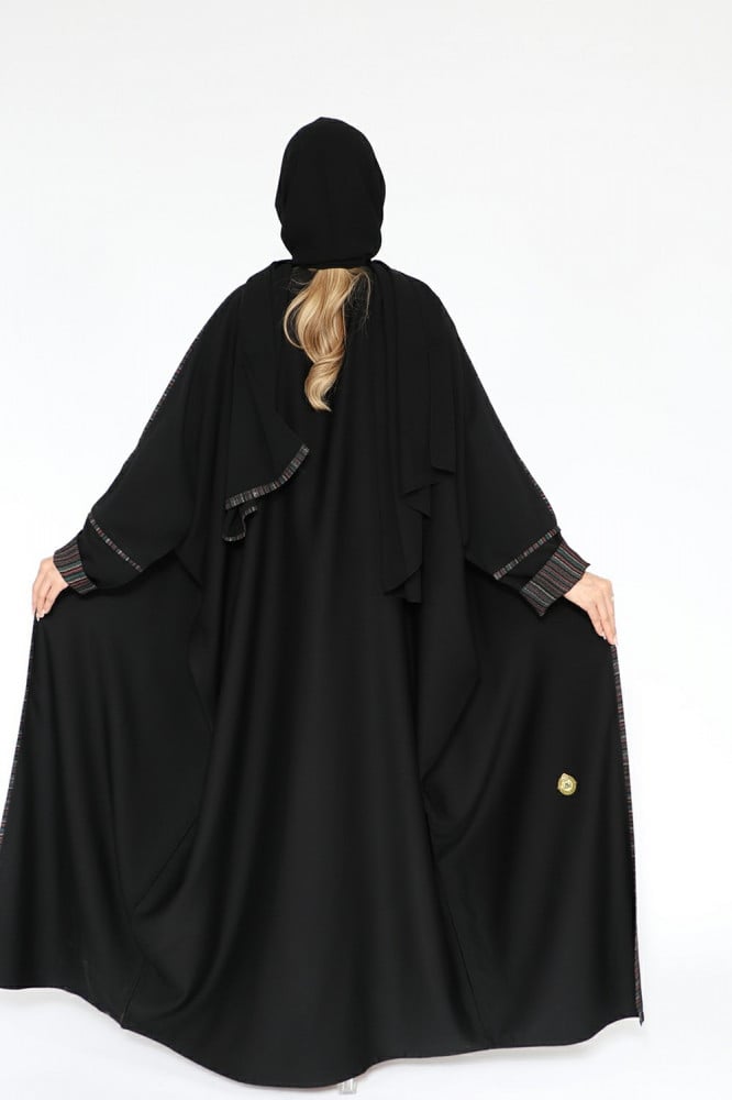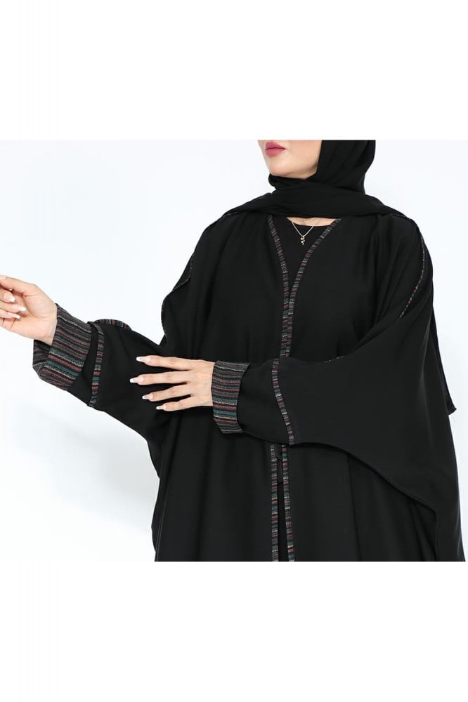 - تتميز تلك العباية السوداء بتصميمها العصري والأنيق وخاصةً بتحديد القيطان الكشميري المخطط الرائع الذي يعطيها مظهرًا مميزًا.
