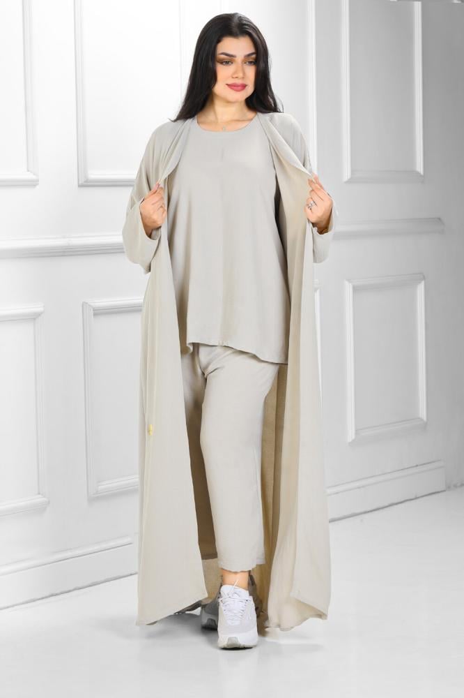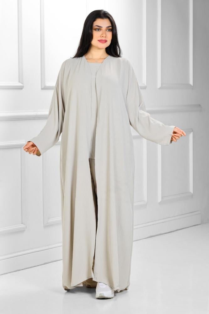 مواصفات طقم "عباية شمس" البيج الفاتح القفلة: لف. اللون: بيج فاتح (Light Beige / Sand). نوع الكم: عادي. القماش: كريب عالي الجودة بملمس ناعم. أخـــرى: المجموعة متكاملة وتشمل طرحة مجانية فاخرة، بالإضافة إلى السديري والبنطلون المصممين من نسيج الكريب المتطابق.