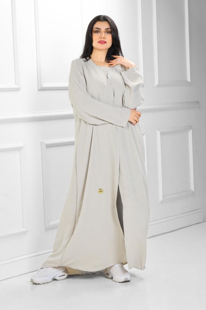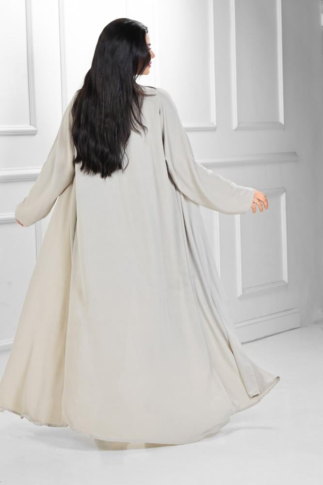- عباية بيج فاتح مصممة بقصّة مرنة تزيد من تناسق القوام وتمنح مظهراً راقياً.