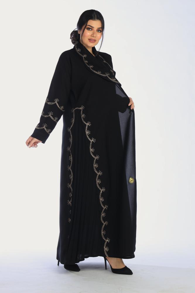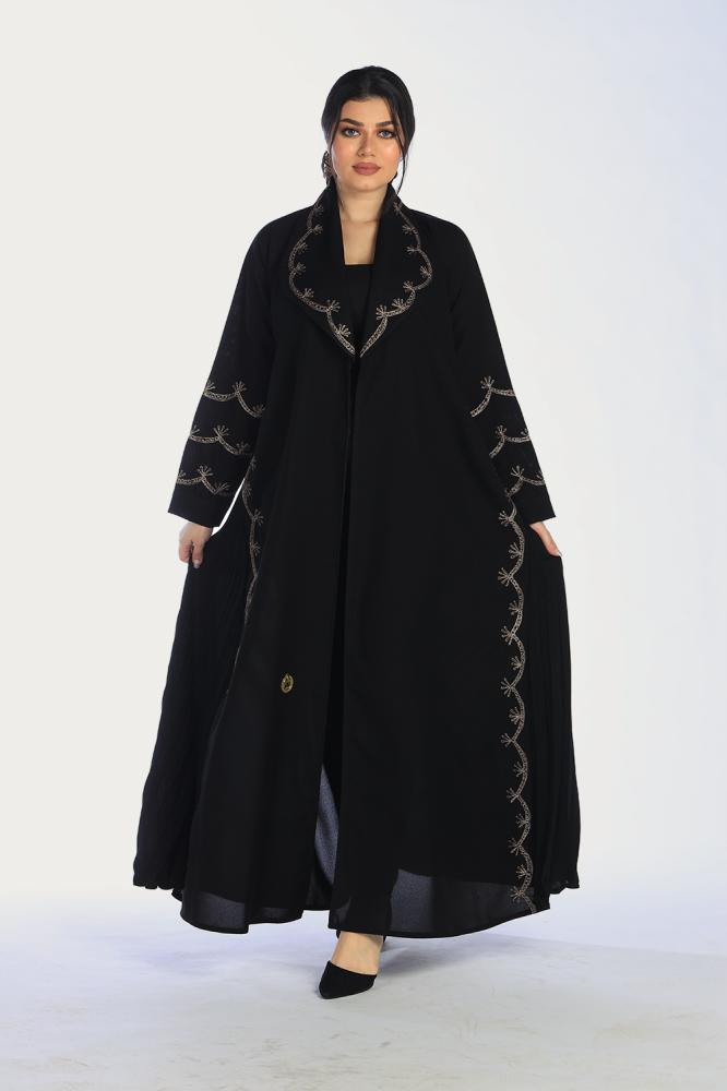 1. عباية سوداء من قماش كريب فاخر بتطريز نحاسي بالقلاب مع طرحة مجانية