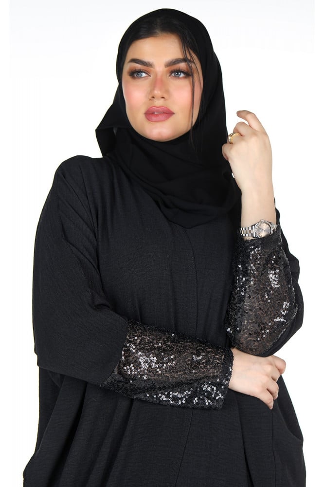 - يتم إدخال ترتر اسود لكم العباية، والذي يساعد في اضافة اللمسة الجميلة والفريدة من نوعها للعباية.