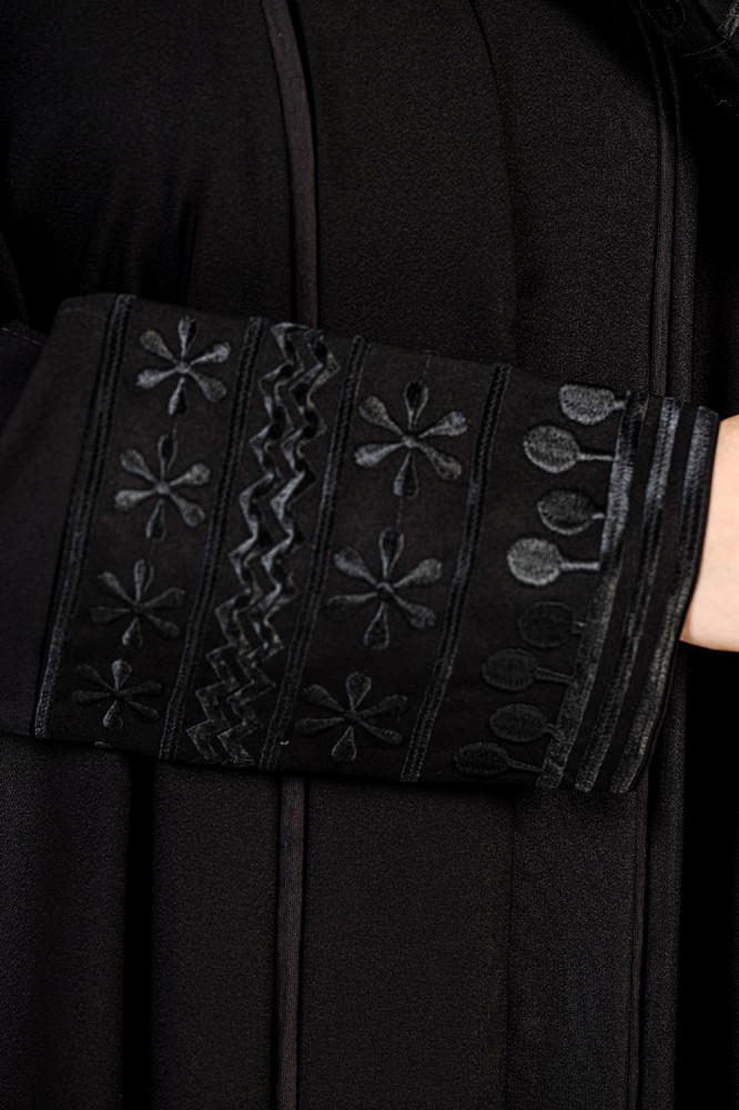 - تمتاز هذه العباية بتفاصيل راقية، حيث يتميز الكم بتطريز أسود يضفي عليها لمسة من الجمال والفخامة.