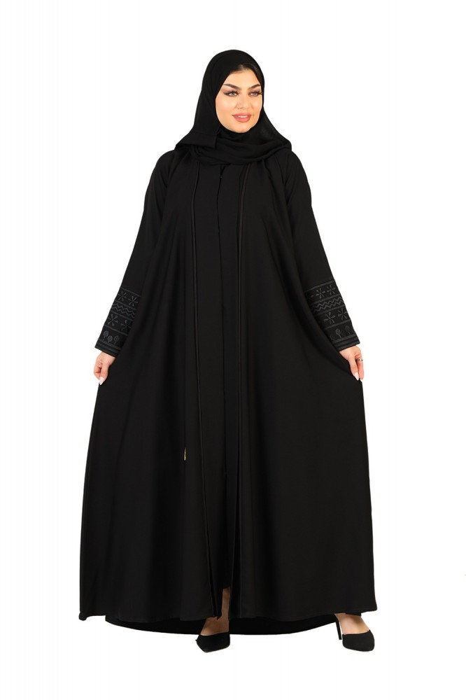 مواصفات عباية سوداء مطرزة بالكم بياقة دبل قماش صالونا