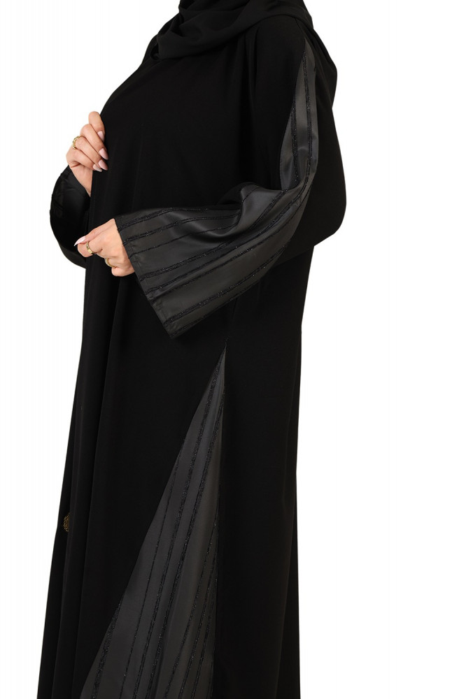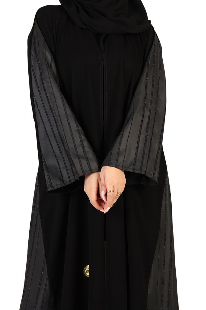 - تضيف التفاصيل المقلمة السوداء على الكم والجوانب لمسة فريدة ومميزة للعباية، وتعتبر العباية مناسبة لمختلف المناسبات.