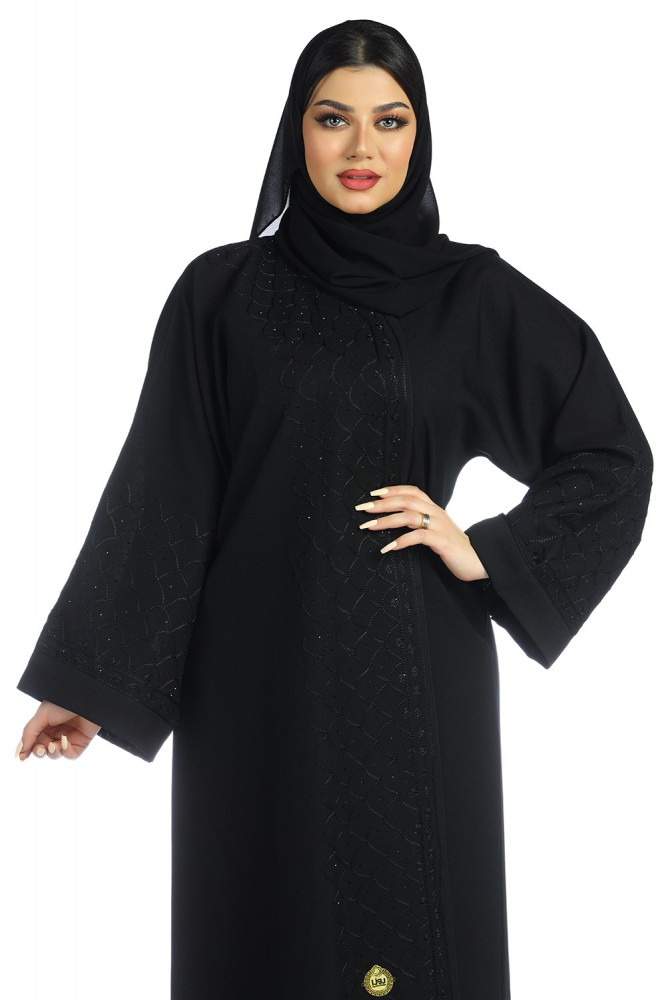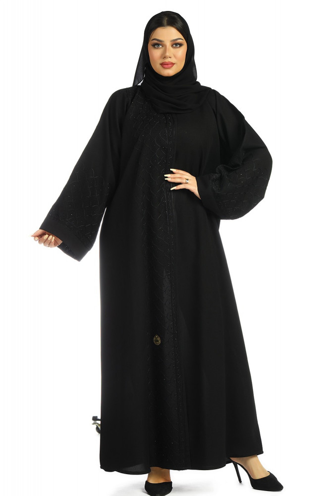 تنفرد عبايه كريب بكرستال اسود منثور بتصميمها المميز والأنيق، حيث تأتي بنوعية قماش من الكريب الفاخر، كما تتميز بتطريز أسود في اليمين مع كرستال أسود منثور حيث تأتي بنوعية كم مربع ولون أسود، وتتميز بقفلة زرارات تمنحها شكلاً أكثر جمالاً وانسيابية.
