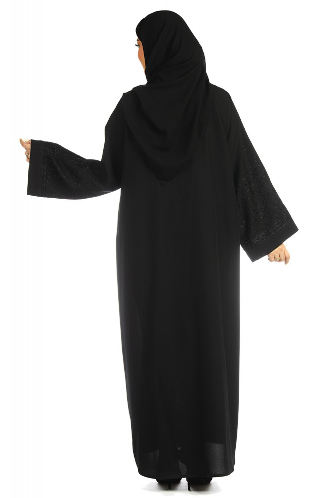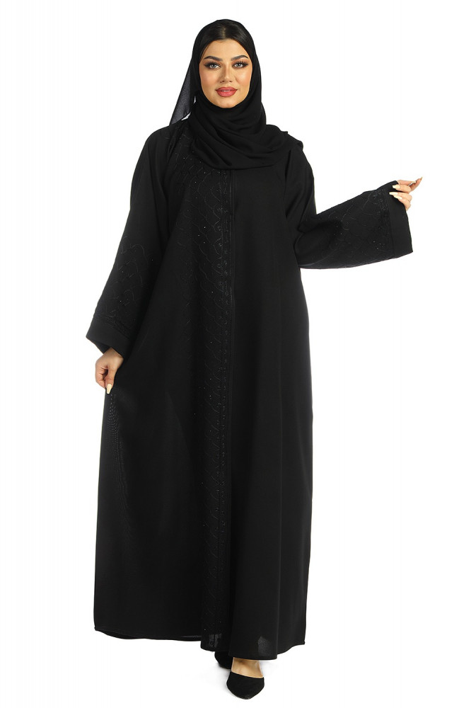 - هذه العباية مصنوعة من كريب فاخر مزينه بتطريز اسود في اليمين، مما يضيف لمسة من الأناقة والجمال.