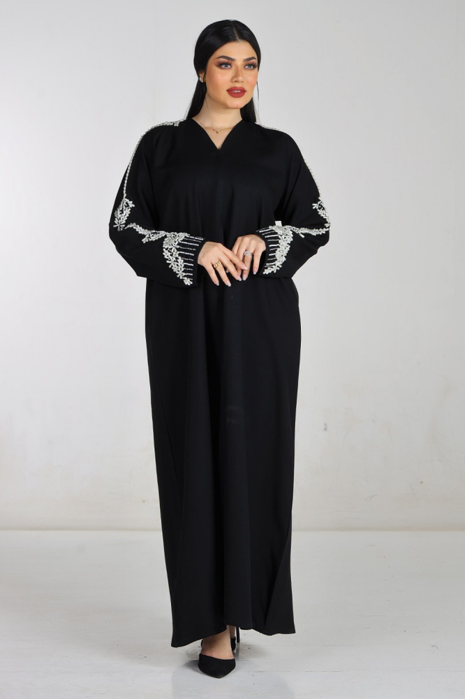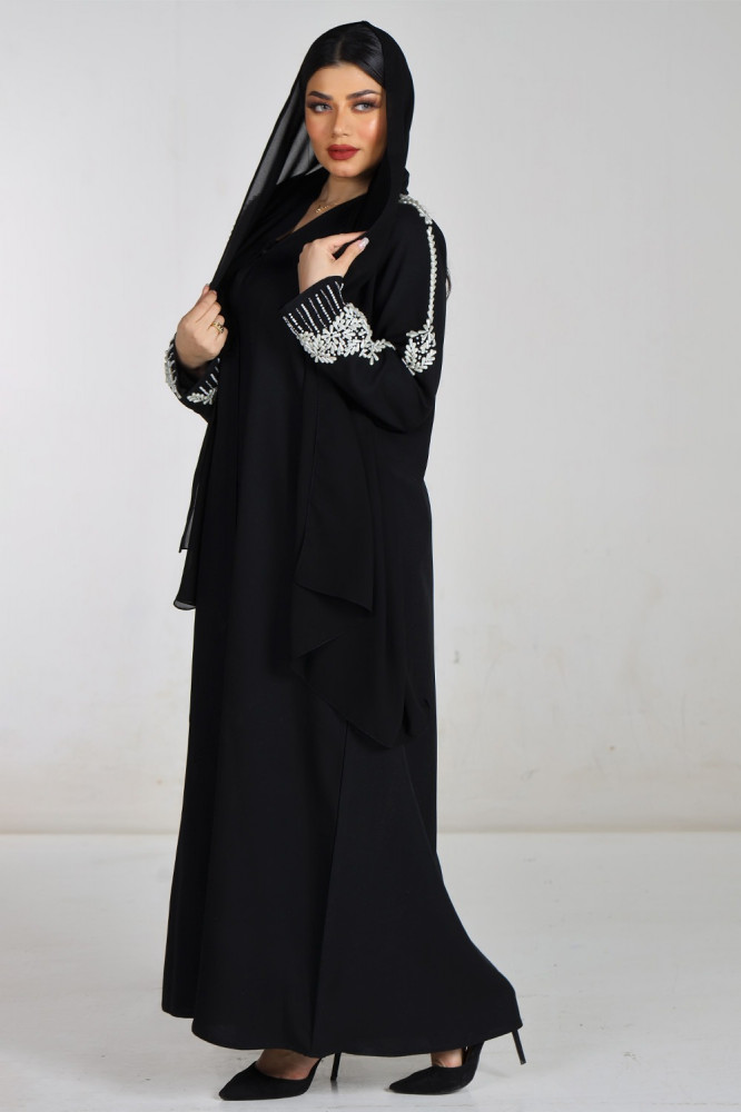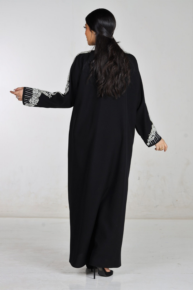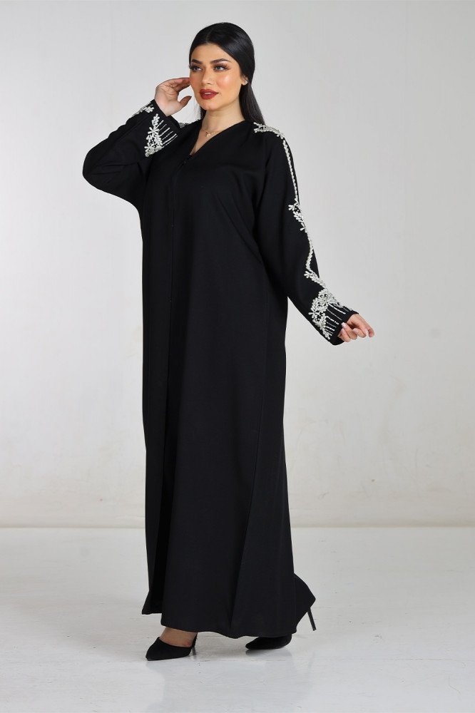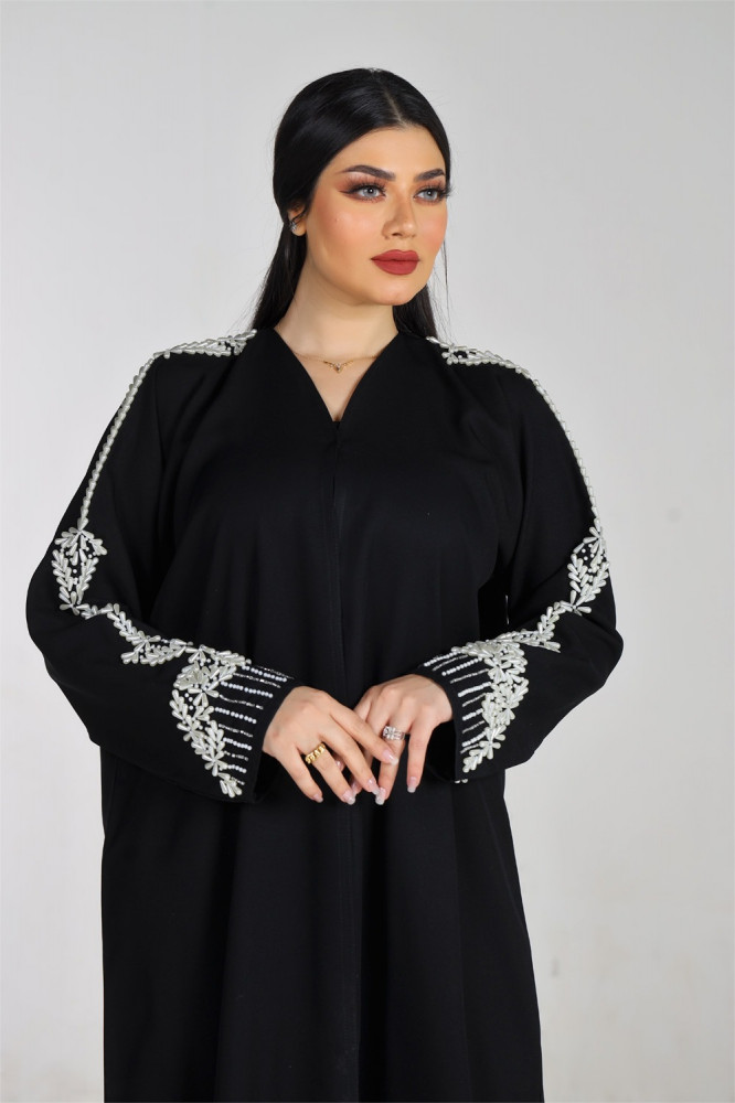 - يأتي الكم العادي بشك يدوي ولؤلؤ ابيض في الكم كاملاً، مما يضيف لمسة من الفخامة والأناقة للعباءة وجاذبية خاصة تلفت الأنظار على إطلالتك.