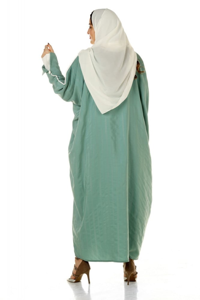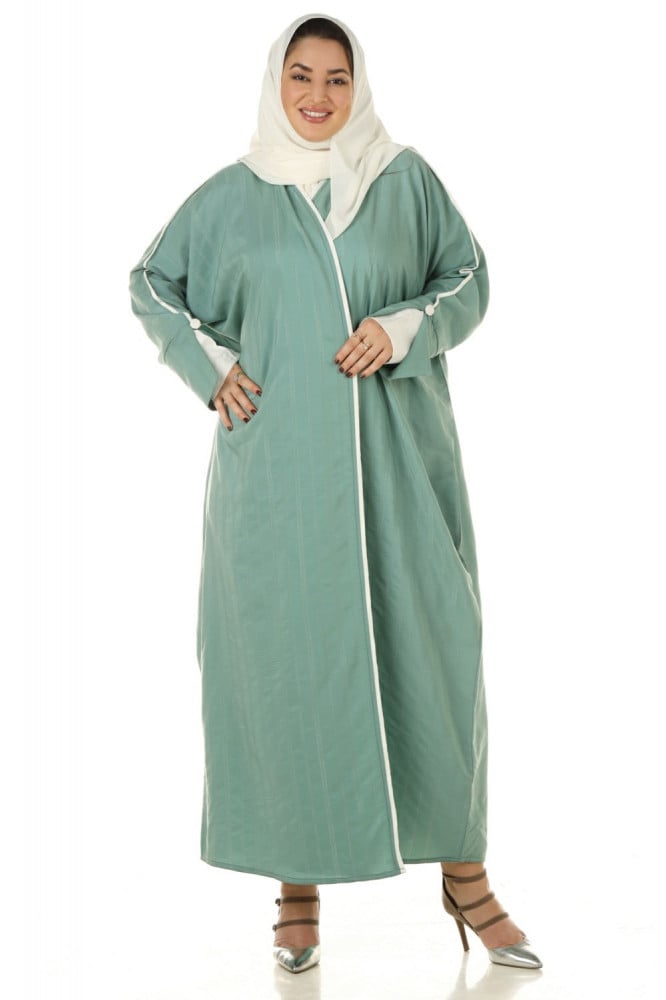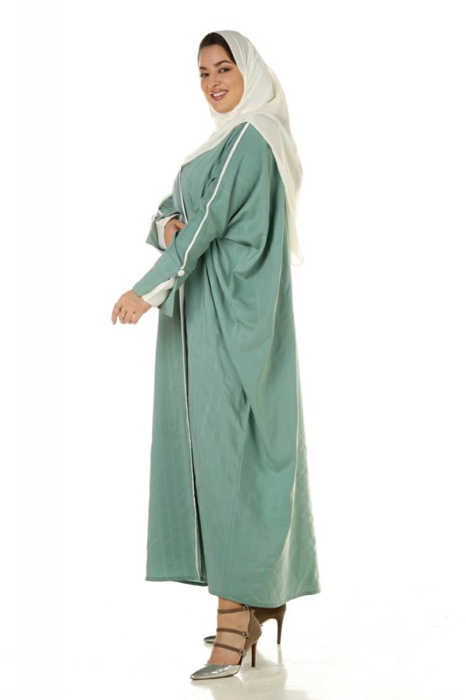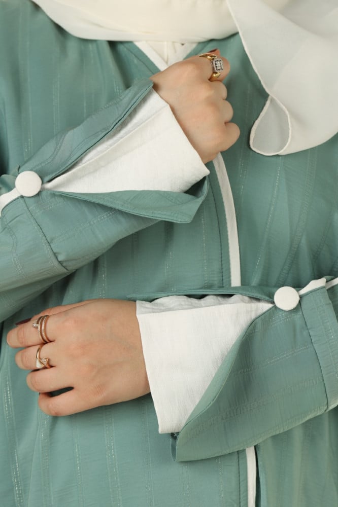 - تتميز العباية بلونها التيفاني المميز بتصميمها العصري والأنيق وخاصةً التحديد السكري مع الكم الطبقتين التي تعطيها مظهرًا مميزًا.