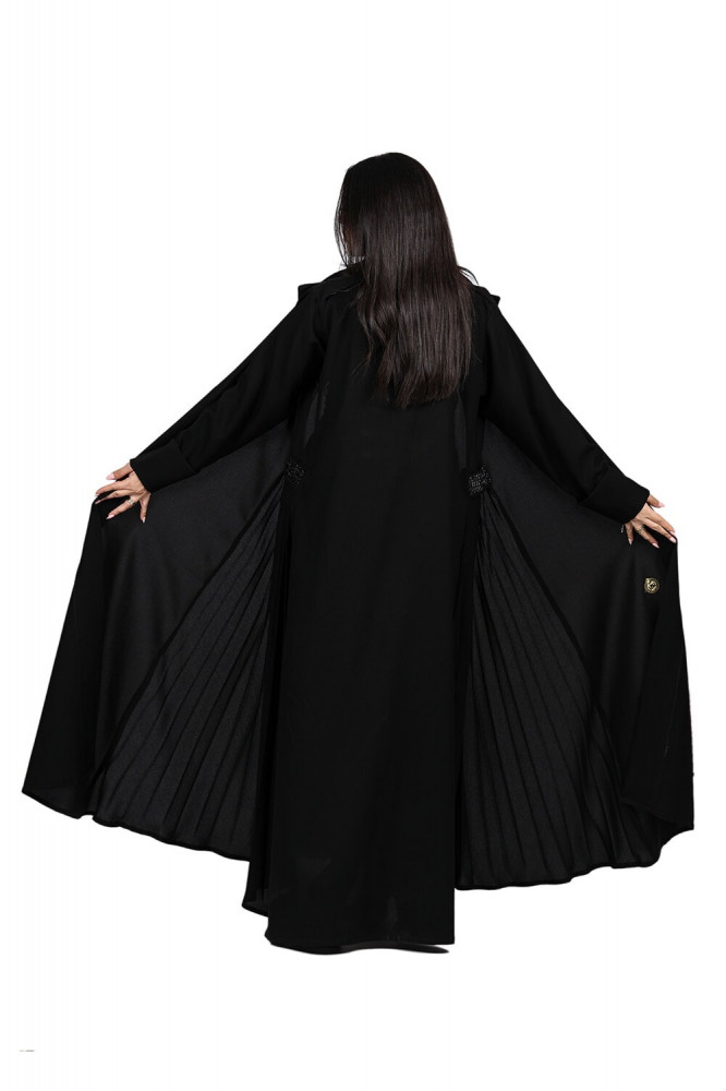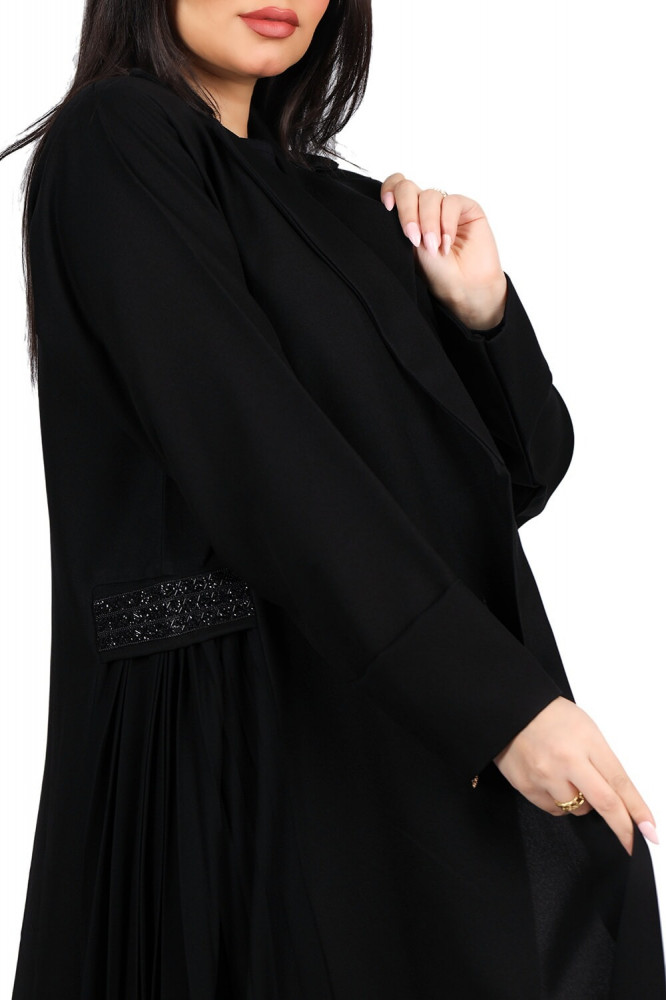 عباية كلوش بكسرات بليسيه في الجوانب وتطريز أنيق باللون الأسود، تُعد إحدى القطع المميزة التي تتمتع بالعديد من الخصائص الجمالية والعملية معاً، كما تُقدم لك تجربة فريدة ومميزة من خلال تركيبتها المتميزة من القماش الصالونا وتصميمها الرائع.