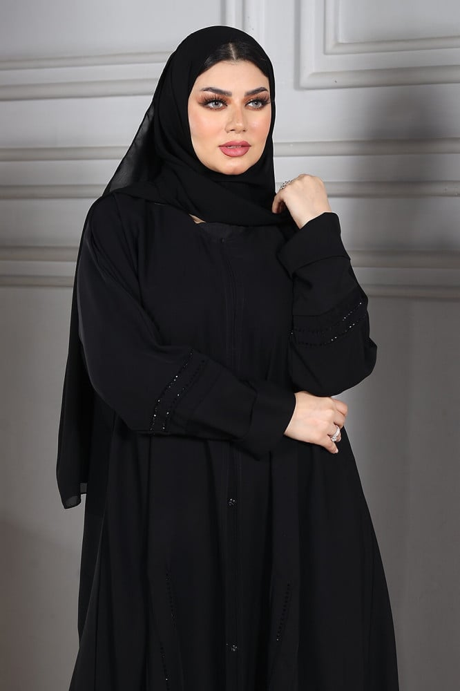- يتم إغلاق العباية بزرارات متناغمة مع اللون الأسود، مما يضيف لمسة من التفرد والأناقة إلى المظهر النهائي.
