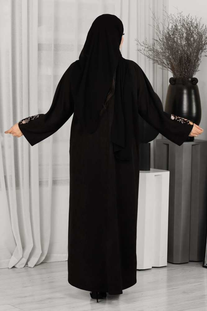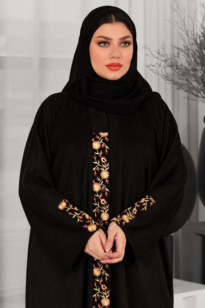مواصفات عباية بياقة شتوية سوداء من قماش الشامواه بكم مطرز ورد