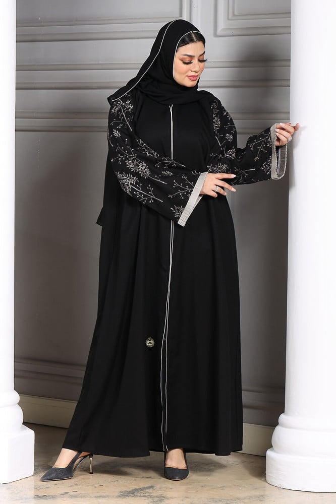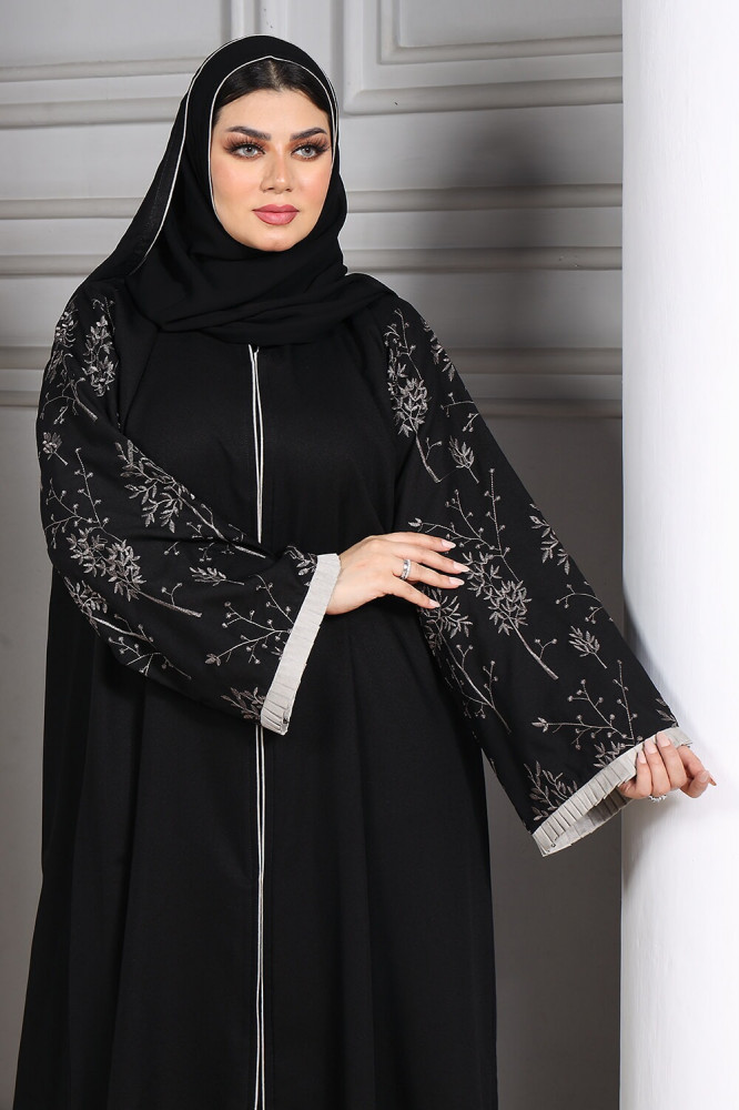 - يتميّز الكم بتطريز مشجر يضيف لمسة فريدة وجميلة، يتم إغلاق العباية بواسطة زرارات مما يعزز من سهولة ارتدائها بسرعة.