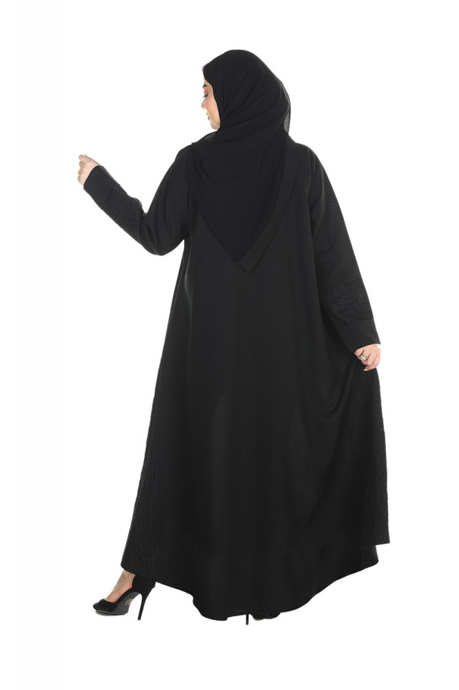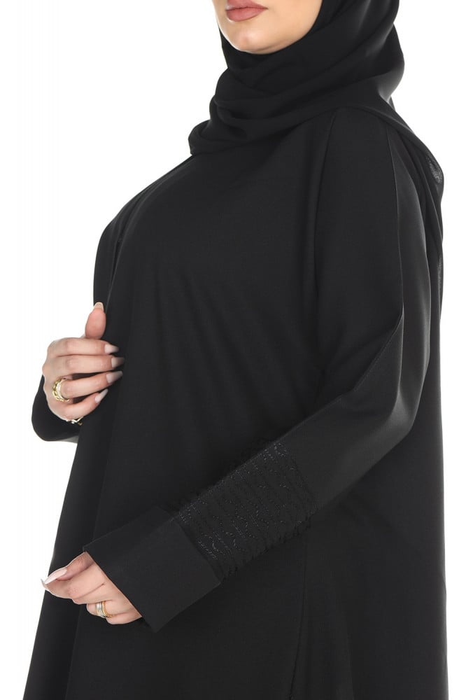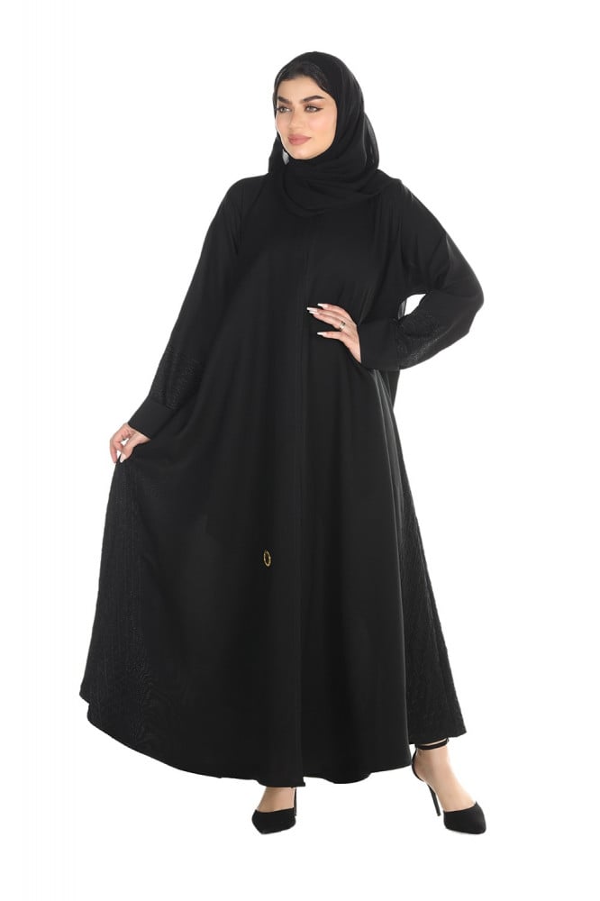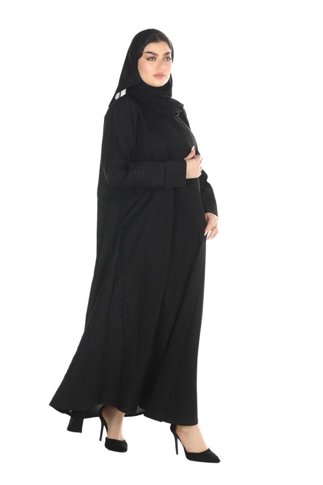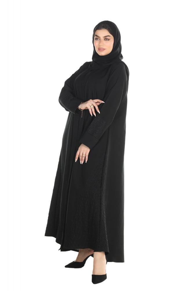 - تتميز هذه العباية بتدخيلات من التطريز الأسود الناعم على الكم والجوانب، مما يضفي لمسة جمالية وأنثوية على التصميم. بالإضافة إلى ذلك، تأتي العباية بأكمام سفطة تعزز من جمالها وتضفي لمسة من الأناقة العصرية