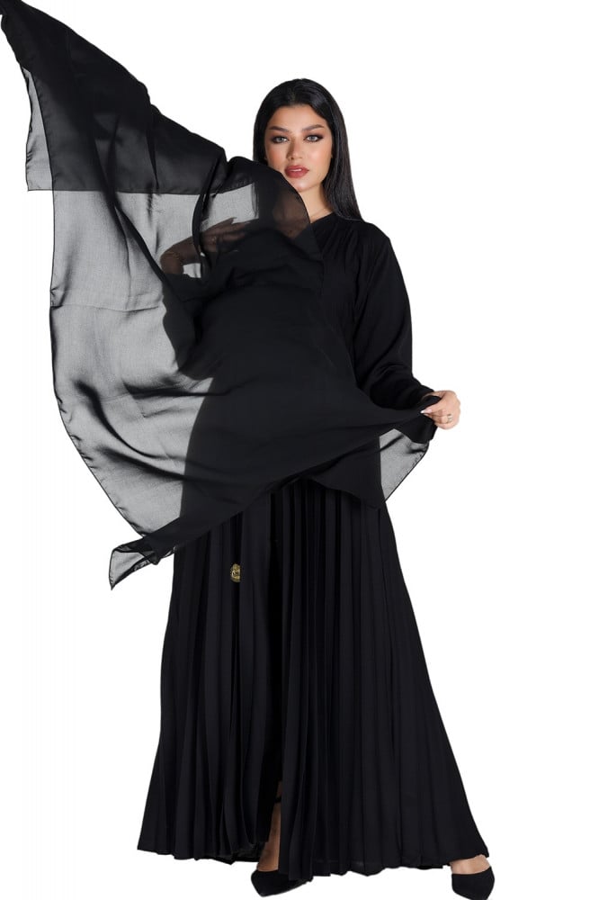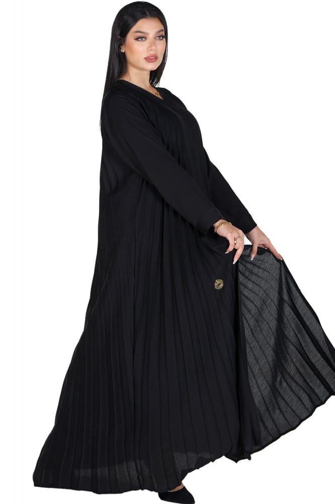 - تتميز العباية أيضًا بتدخيلات بليسيه تجعلها تبرز بأناقة فريدة، حيث تأتي الكسرات بليسيه على طول العباية لتضفي لمسة من الجمال والأنوثة على الإطلالة بشكل عام.