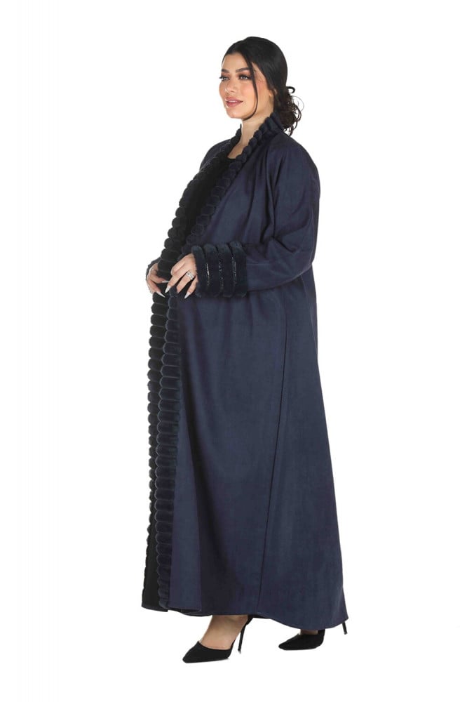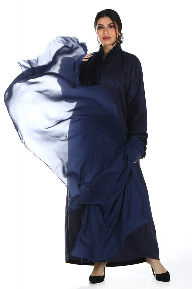 عباية شتوية كحلي شمواه ناعم وفرو مع كرستال في الكم والامام مع طرحتها